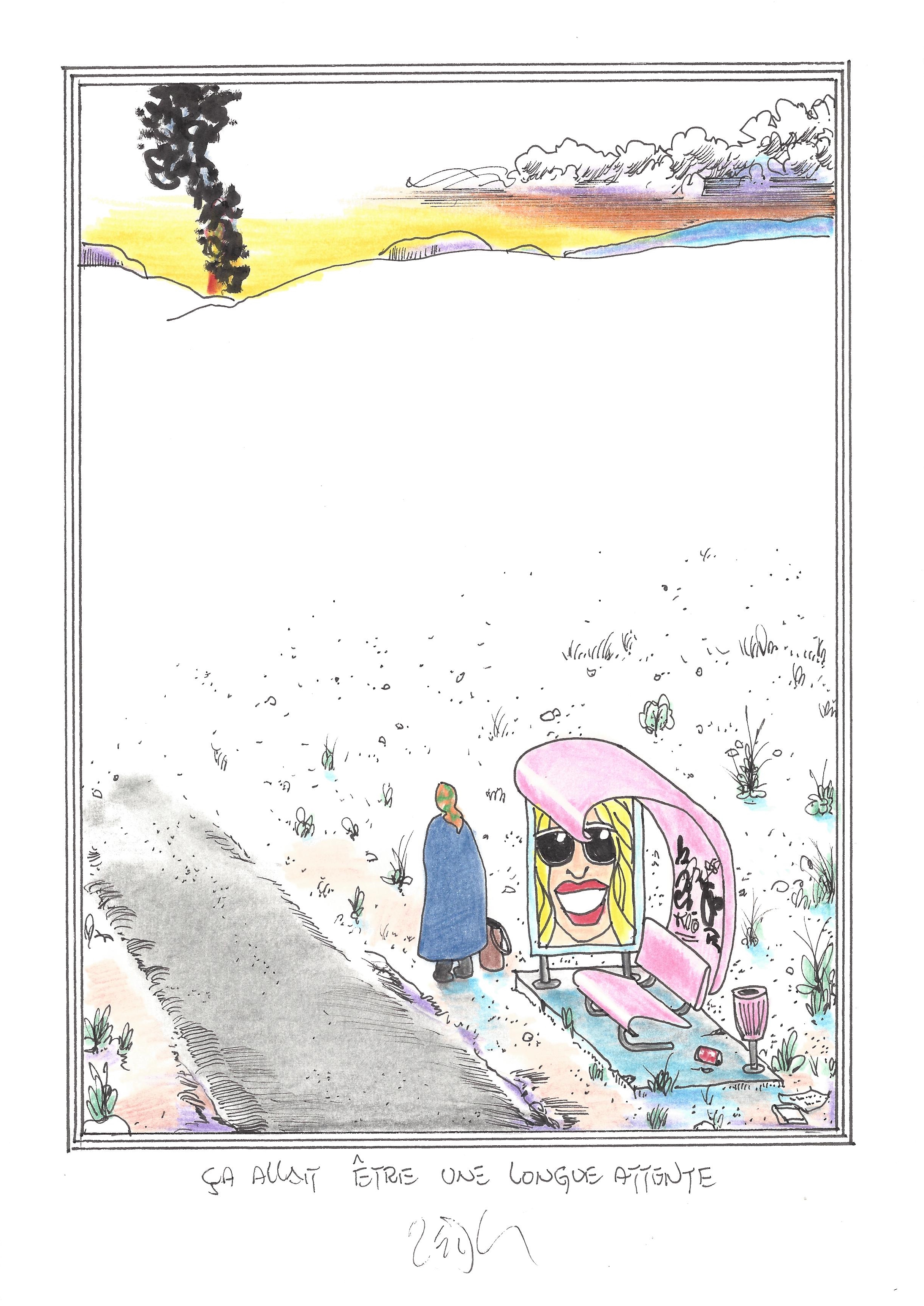 Drawing of the Day – 2498 – Dessin du jour « It was going to be a long wait – Ça allait être une longue attente » Ink & color on Paper – 8 x 12″ (21 x 30 cm) – Encre & couleurs sur Papier