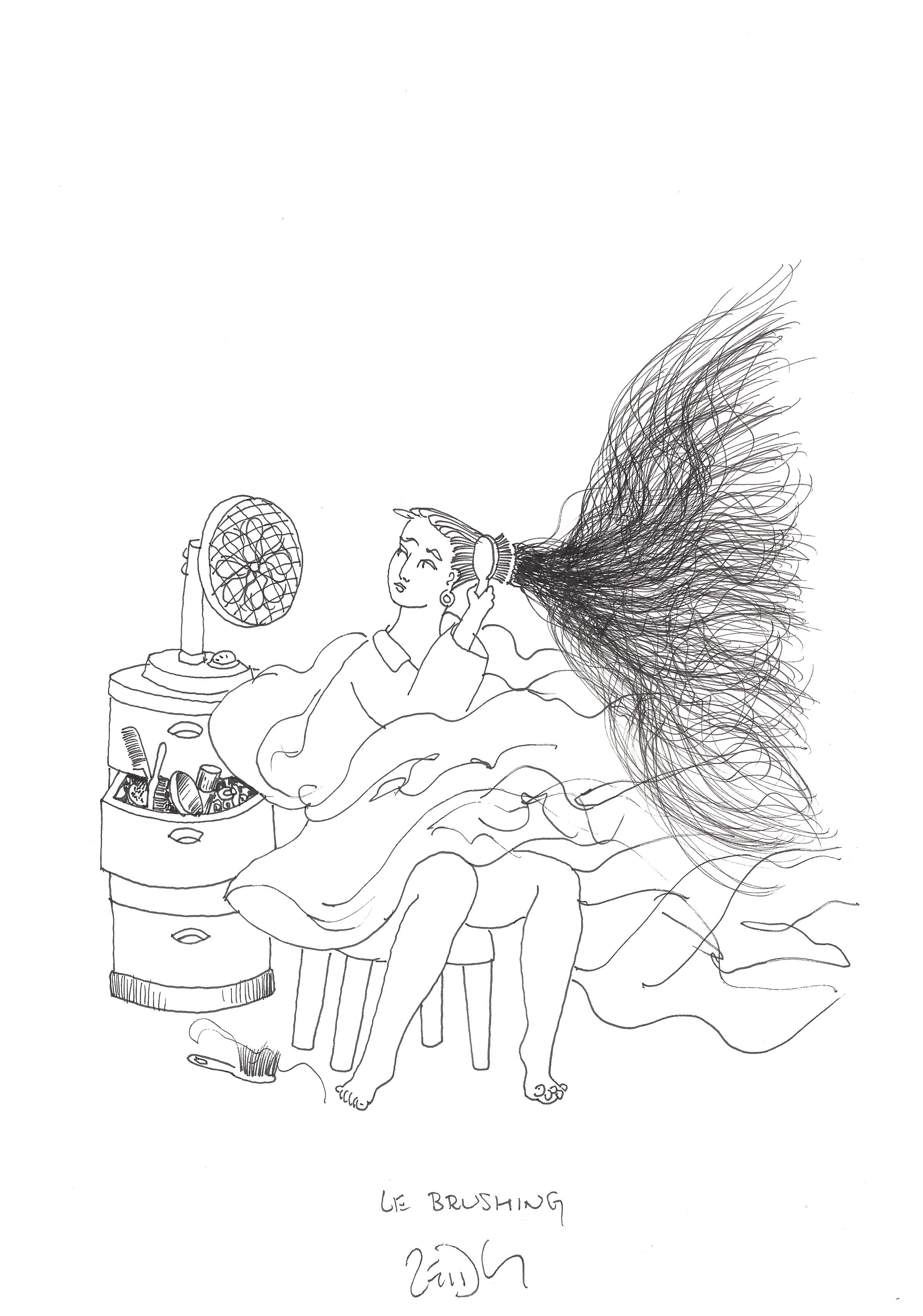 Drawing of the Day – 2499 – Dessin du jour « Le brushing » Ink on Paper – 8 x 12″ (21 x 30 cm) – Encre sur Papier