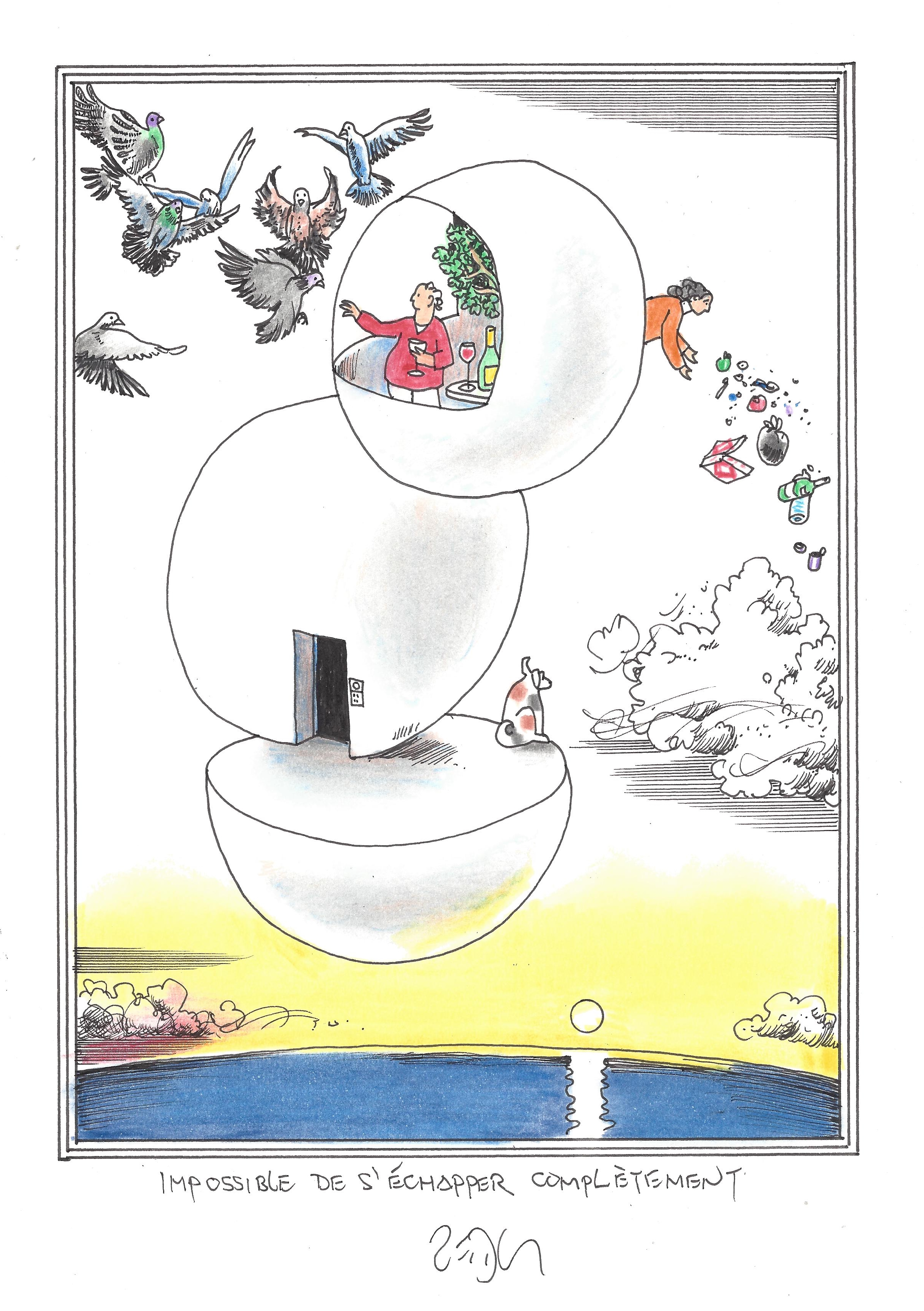 Drawing of the Day – 2480 – Dessin du jour « You just can’t get away from it all – Impossible de s’échapper complètement » Ink & color on Paper – 8 x 12″ (21 x 30 cm) – Encre & couleurs sur Papier