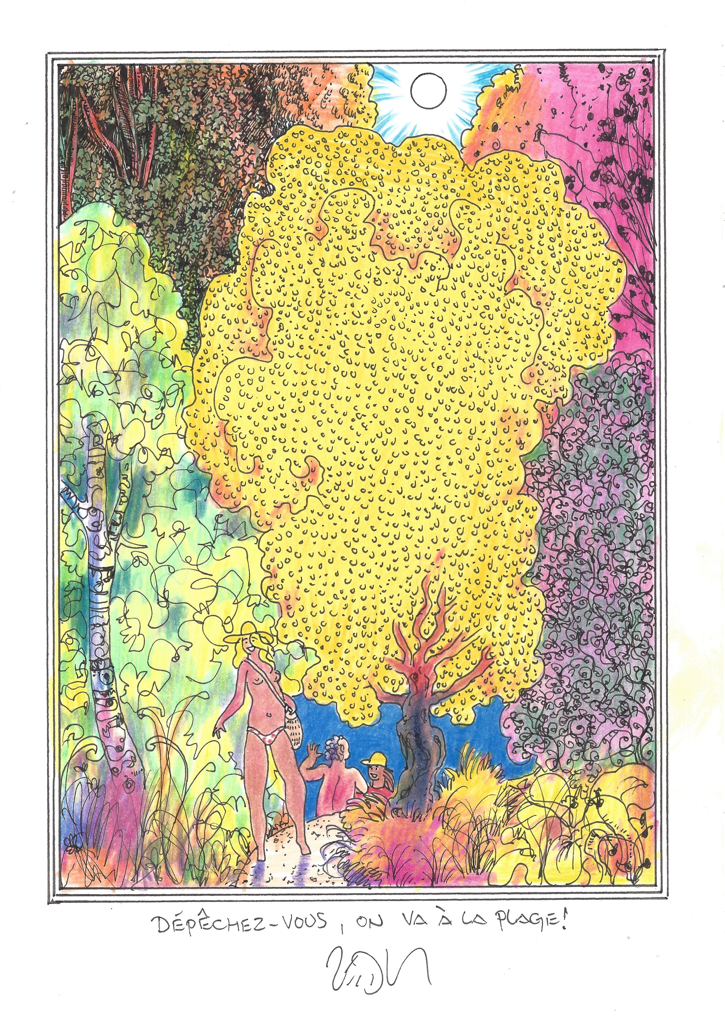 Drawing of the Day – 2481 – Dessin du jour « Hurry up, we’re going to the beach ! – Dépêchez-vous, on va à la plage ! » Ink & color on Paper – 8 x 12″ (21 x 30 cm) – Encre & couleurs sur Papier