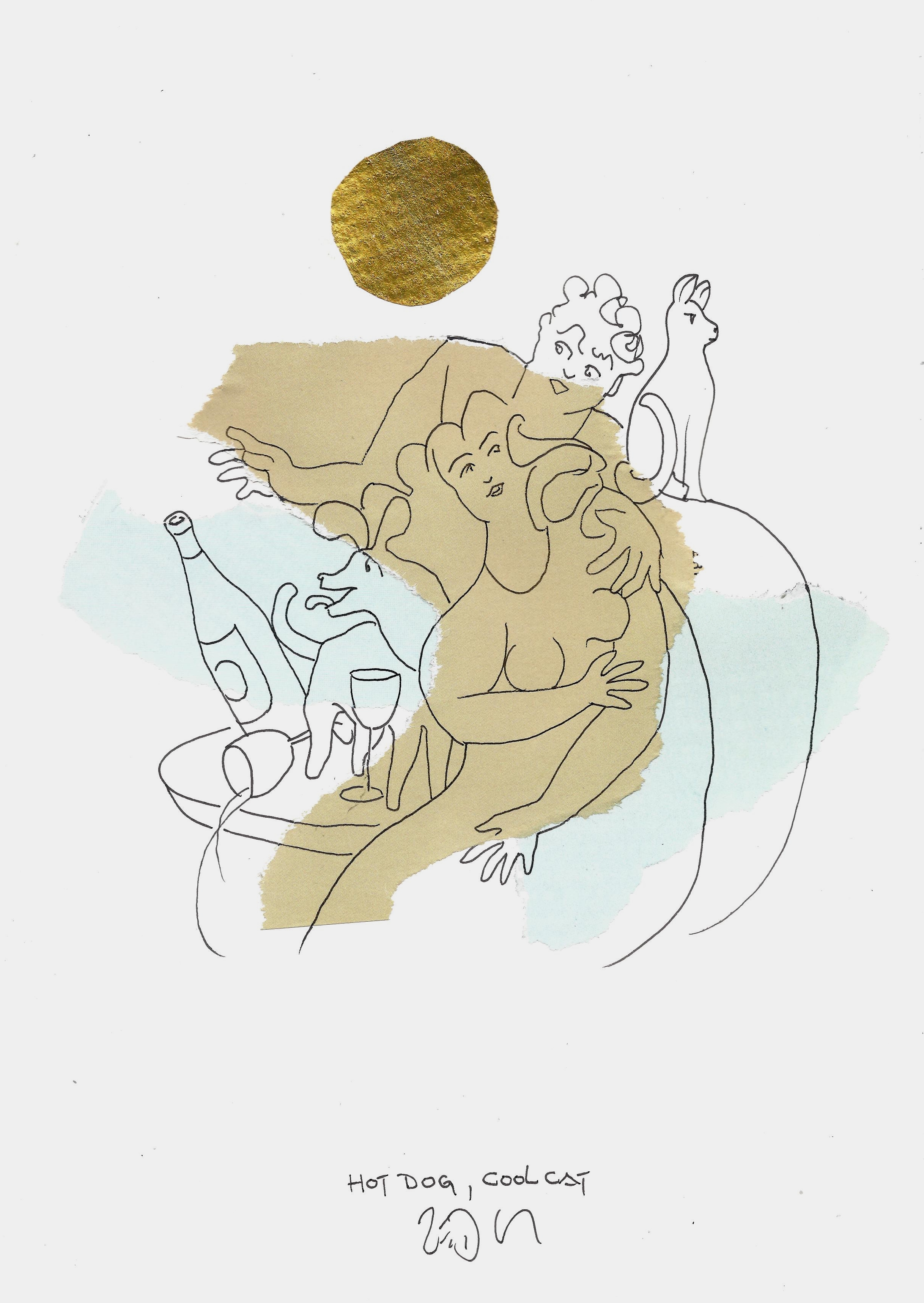 Drawing of the Day – 2482 – Dessin du jour « Hot dog, cool cat » Mixed Media on Paper – 8 x 12″ (21 x 30 cm) – Technique mixte sur Papier