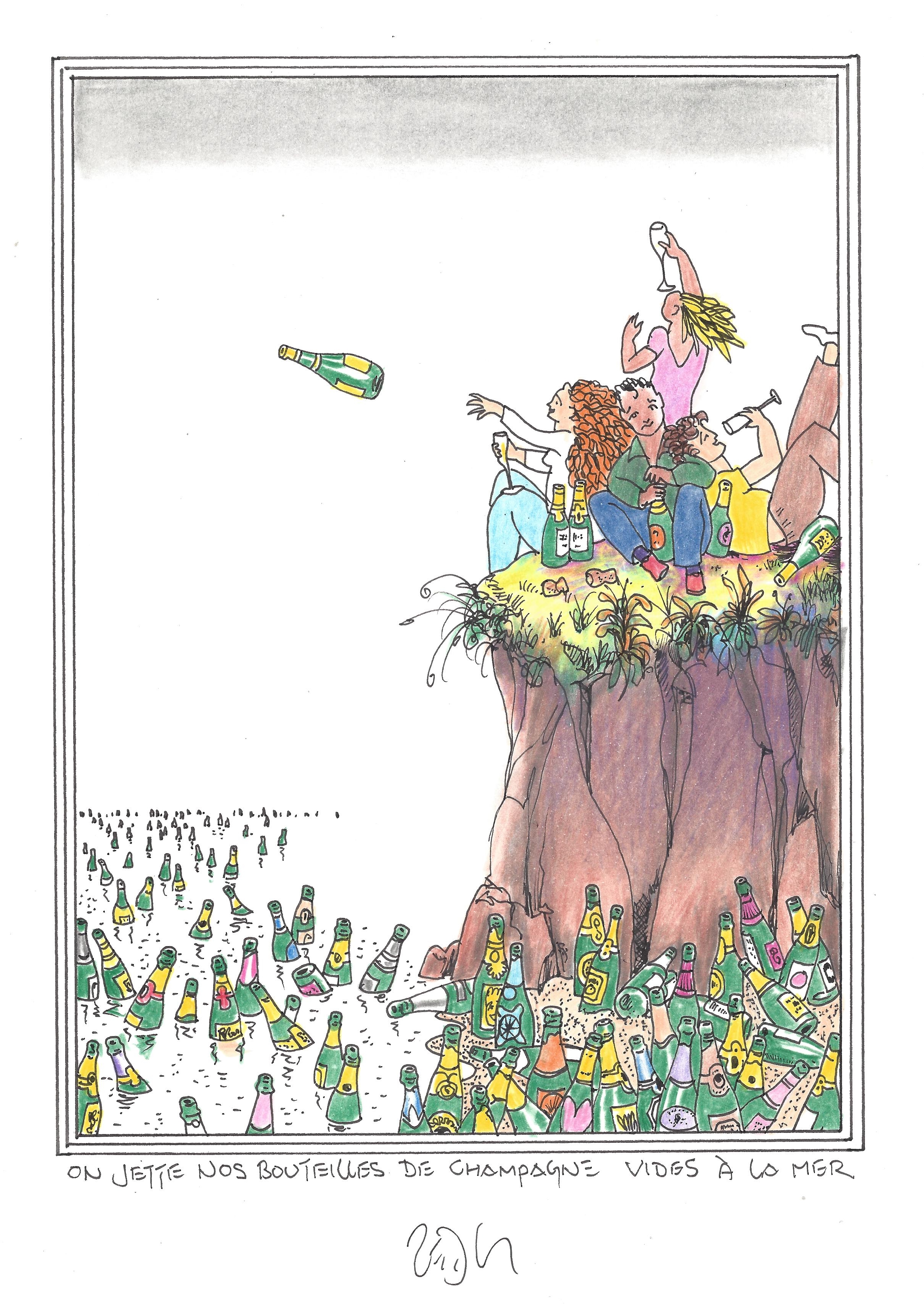 Drawing of the Day – 2483 – Dessin du jour « Throwing our empty champagne bottles into the sea – On jette nos bouteilles de champagne vides à la mer » Ink & color on Paper – 8 x 12″ (21 x 30 cm) – Encre & couleurs sur Papier