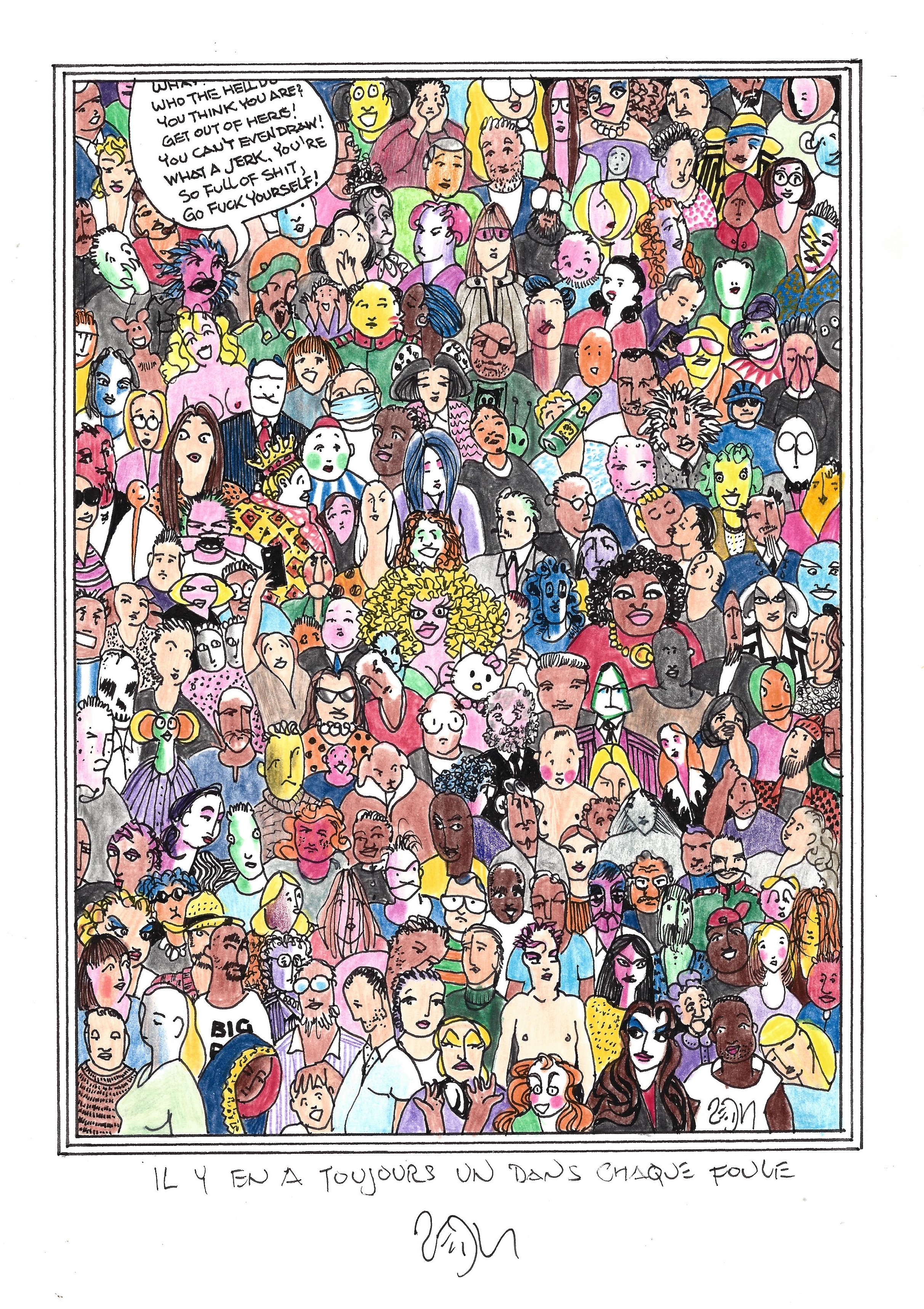 Drawing of the Day – 2484 – Dessin du jour « There’s one in every crowd – Il y a en a toujours un dans chaque foule » Ink & color on Paper – 8 x 12″ (21 x 30 cm) – Encre & couleurs sur Papier