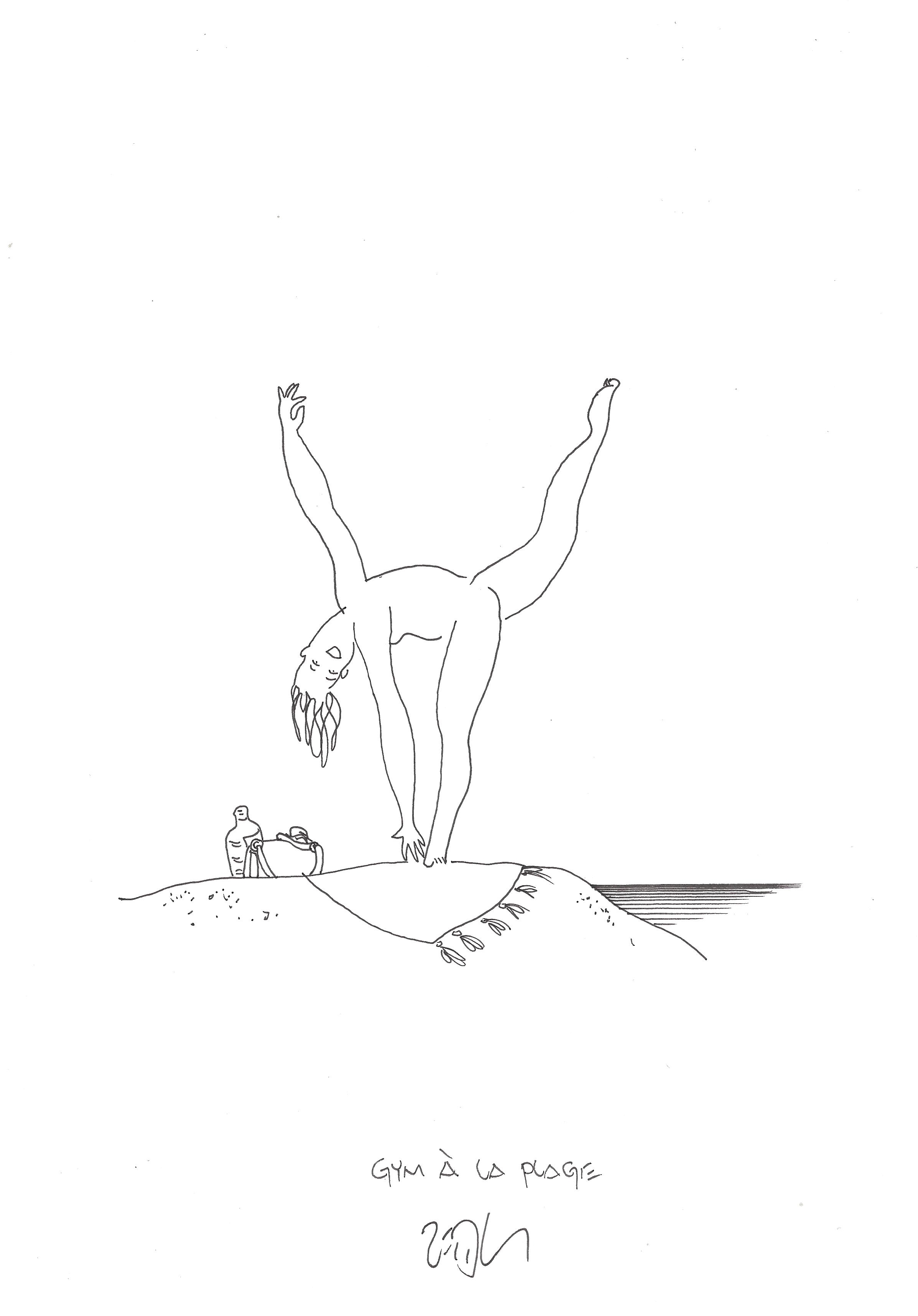 Drawing of the Day – 2485 – Dessin du jour « Exercise at the beach – Gym à la plage » Ink on Paper – 8 x 12″ (21 x 30 cm) – Encre sur Papier