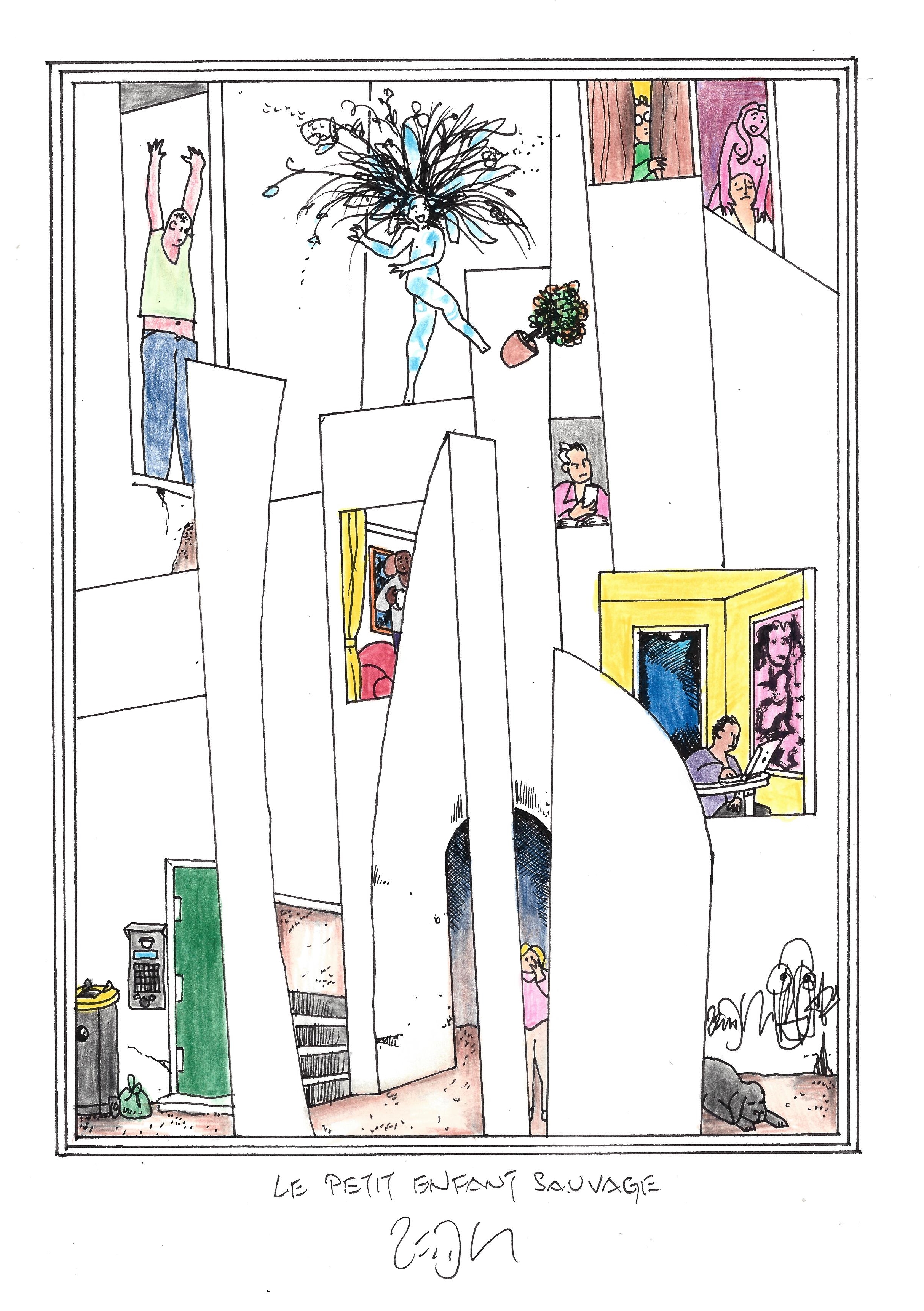 Drawing of the Day – 2486 – Dessin du jour « The little wild child – Le petit enfant sauvage » Ink & color on Paper – 8 x 12″ (21 x 30 cm) – Encre & couleurs sur Papier