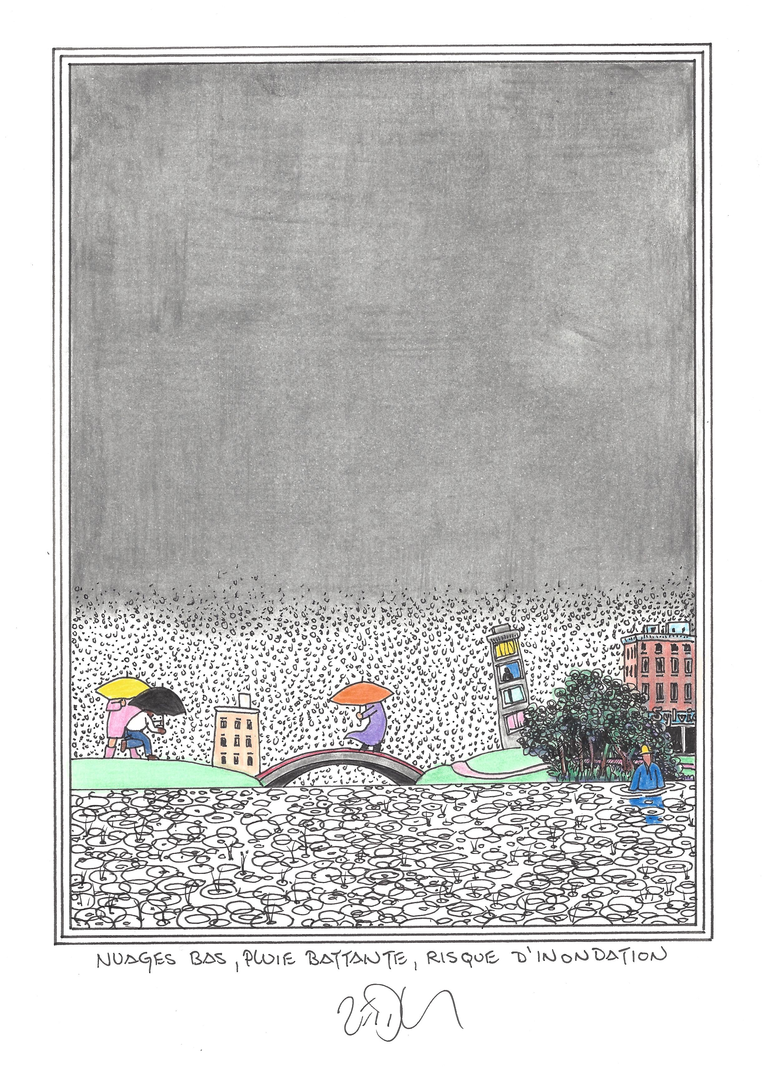 Drawing of the Day – 2453 – Dessin du jour « Low clouds, heavy rain, risk of flooding – Nuages bas, pluie battante, risque d’inondation » Ink & color on Paper – 8 x 12″ (21 x 30 cm) – Encre & couleurs sur Papier