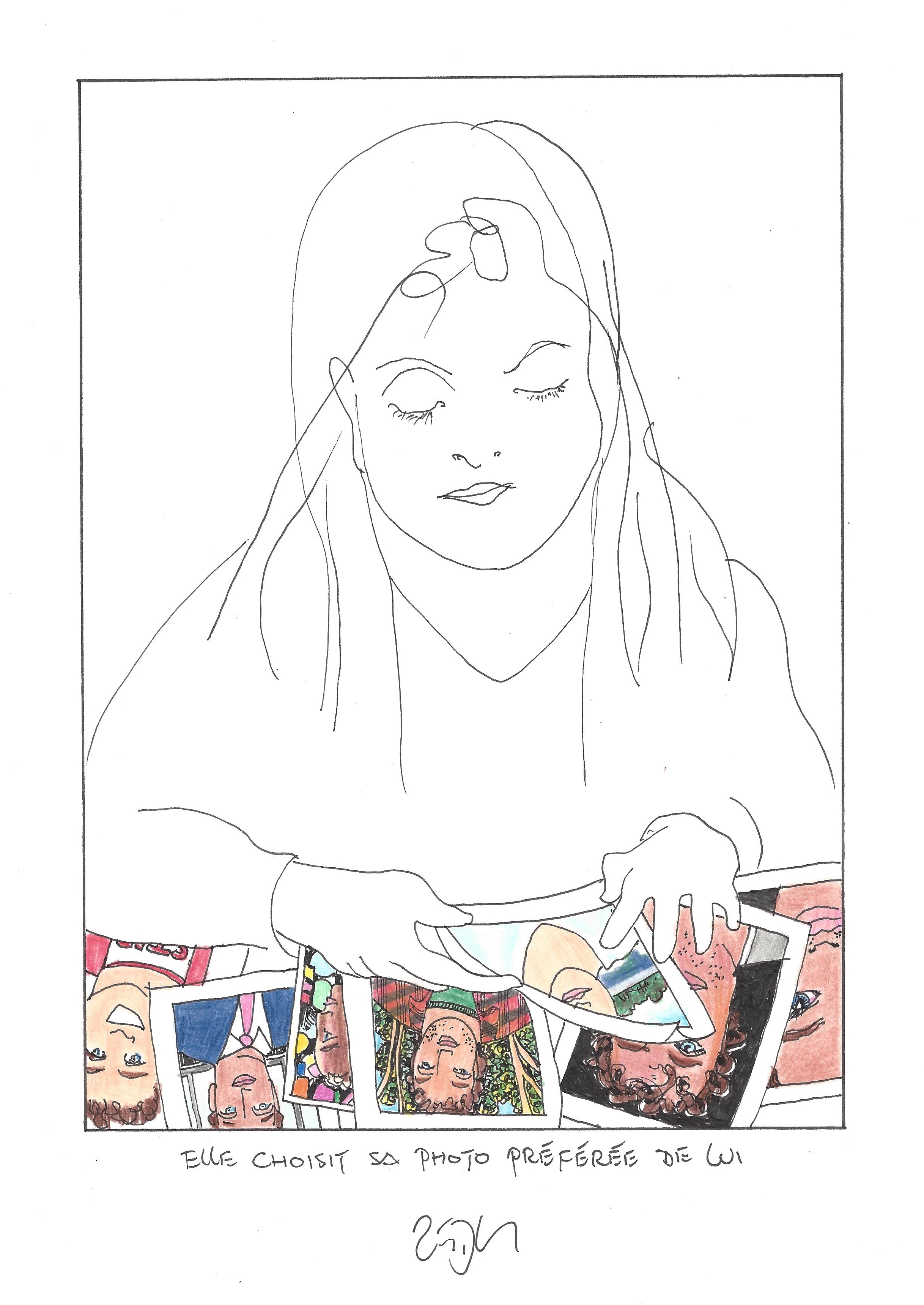 Drawing of the Day – 2456 – Dessin du jour « She selects the picture of him that she likes the best – Elle choisit sa photo préférées de lui » Ink & color on Paper – 8 x 12″ (21 x 30 cm) – Encre & couleurs sur Papier
