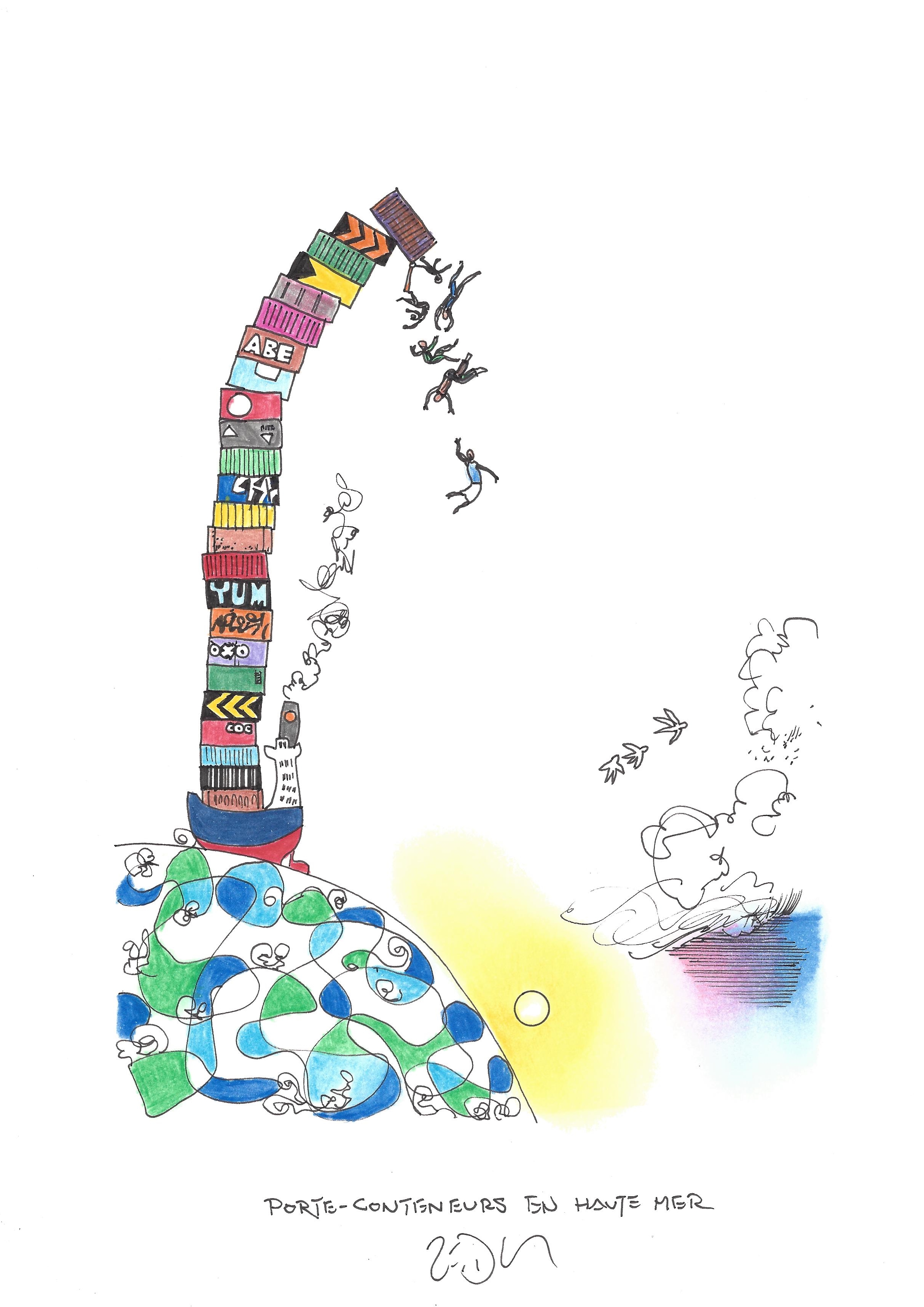 Drawing of the Day – 2458 – Dessin du jour « Container ship on the high seas – Porte-conteneurs en haute mer » Ink & color on Paper – 8 x 12″ (21 x 30 cm) – Encre & couleurs sur Papier