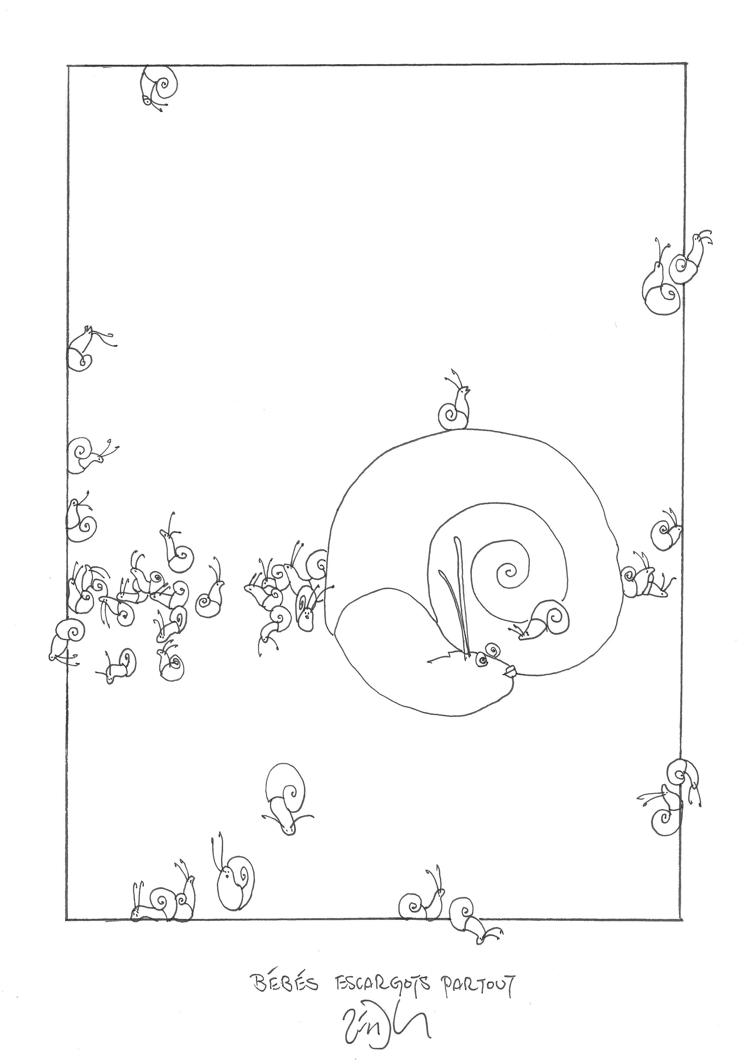 Drawing of the Day – 2459 – Dessin du jour « Baby snails everywhere – Bébés escargots partout » Ink on Paper – 8 x 12″ (21 x 30 cm) – Encre sur Papier