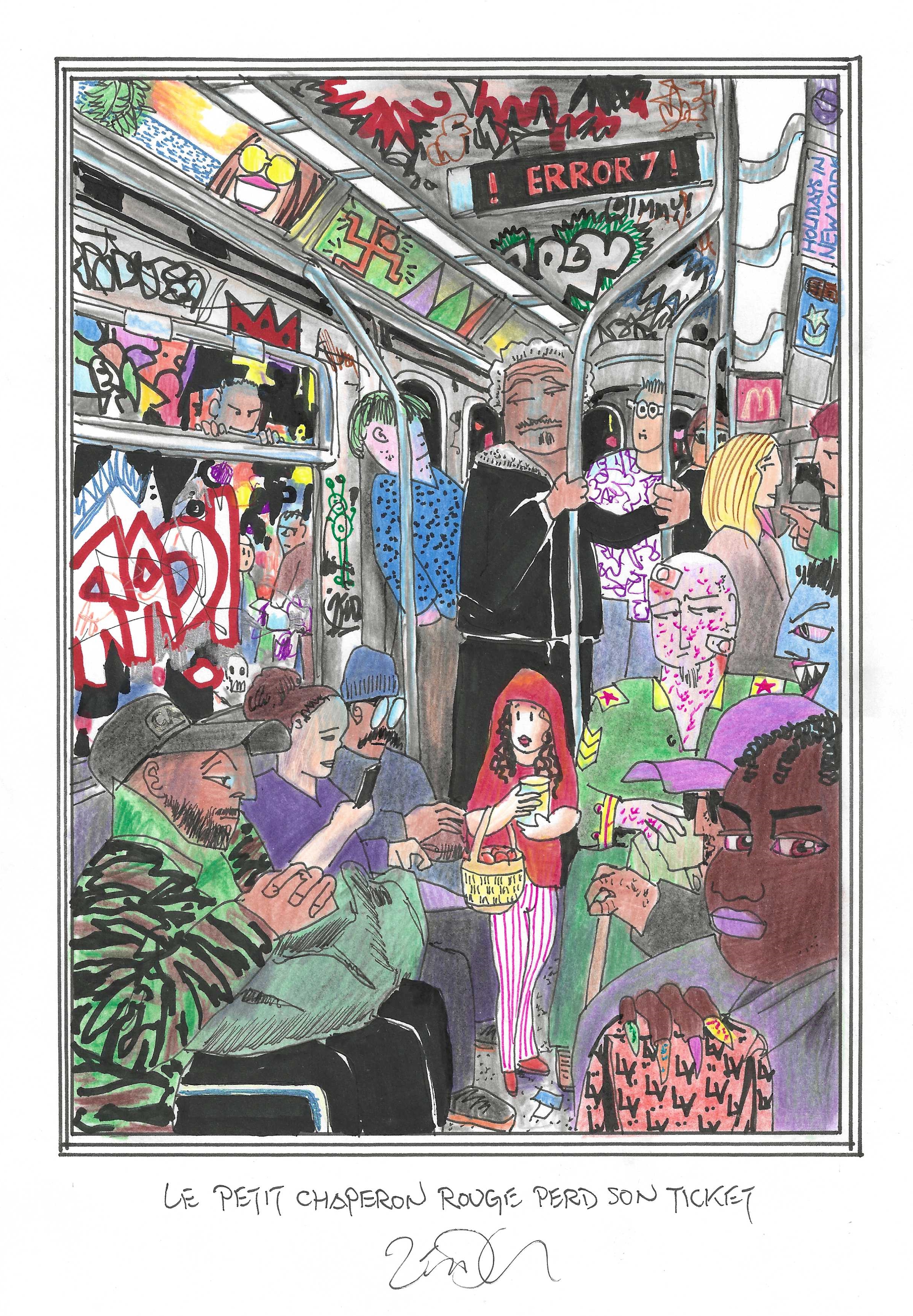 Drawing of the Day – 3595 – Dessin du jour « Little Red Riding Hood loses her ticket – Le Petit Chaperon Rouge perd son ticket » Ink & colour on Paper – 8 x 12″ (21 x 30 cm) – Encre & couleurs sur Papier
