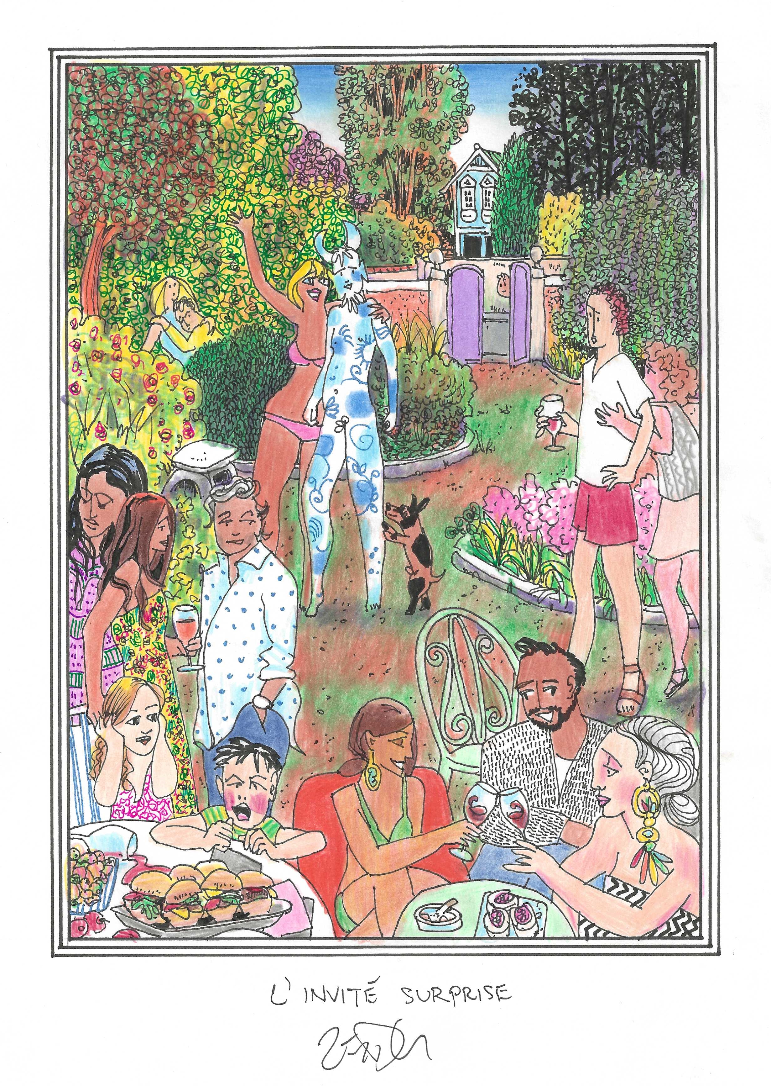 Drawing of the Day – 3597 – Dessin du jour « The unexpected guest – L’invité surprise » Ink & colour on Paper – 8 x 12″ (21 x 30 cm) – Encre & couleurs sur Papier