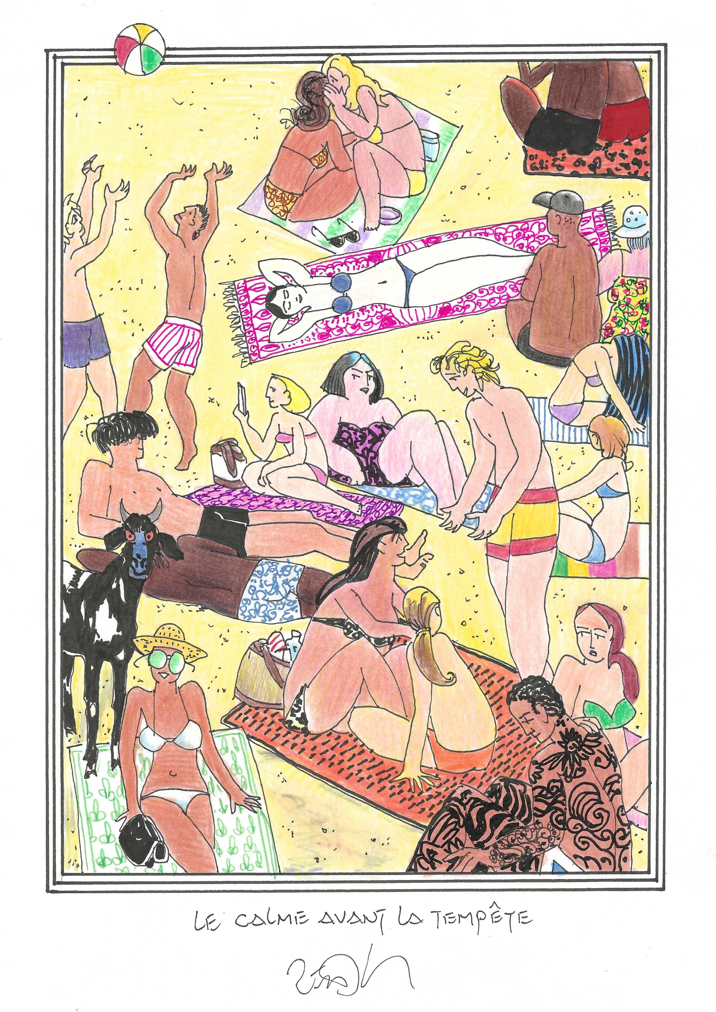Drawing of the Day – 3593 – Dessin du jour « Quiet day at the beach – Journée tranquille à la plage » Ink & colour on Paper – 8 x 12″ (21 x 30 cm) – Encre & couleurs sur Papier