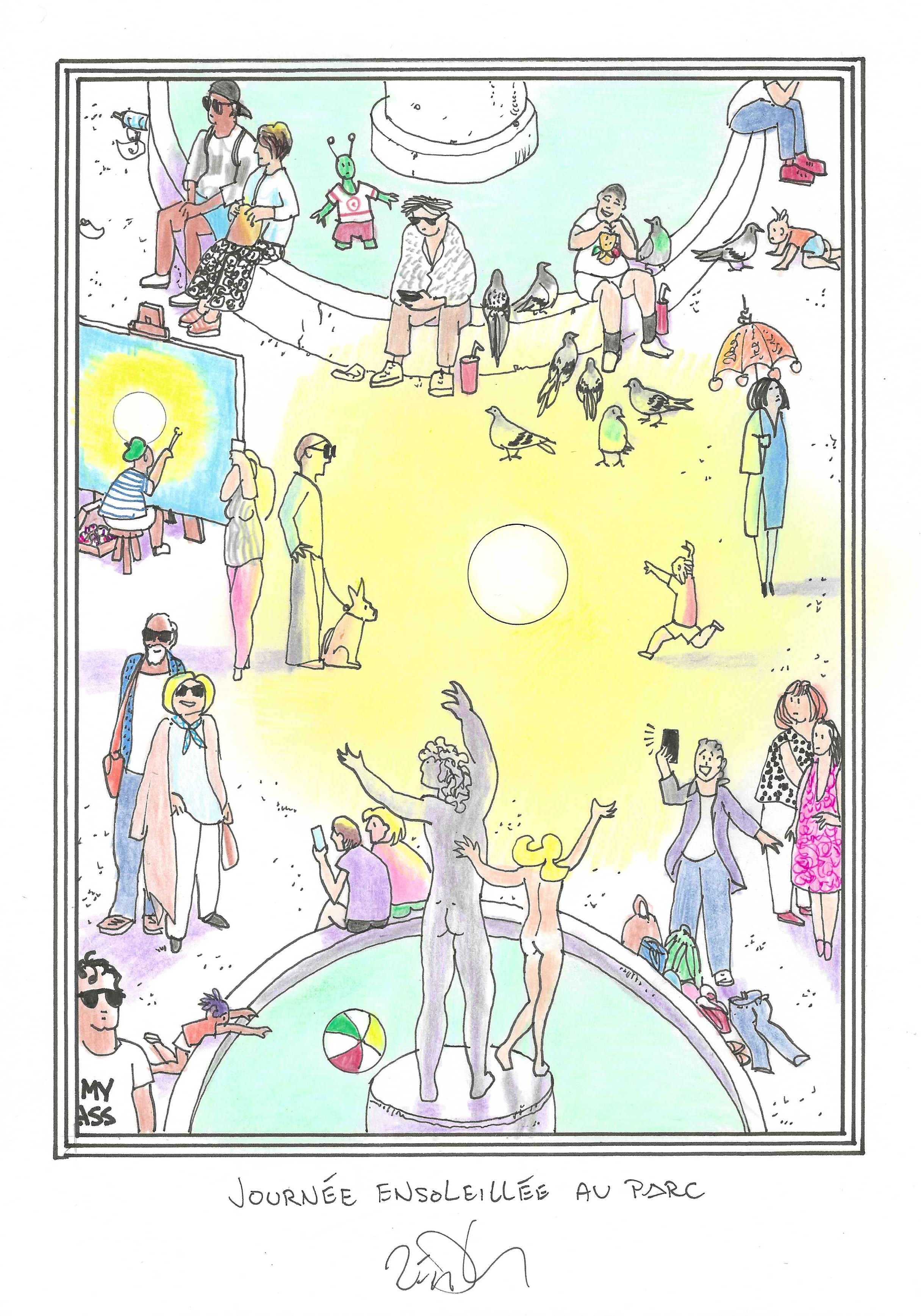 Drawing of the Day – 3601 – Dessin du jour « Sunny day in the park – Journée ensoleillée au parc » Ink & colour on Paper – 8 x 12″ (21 x 30 cm) – Encre & couleurs sur Papier