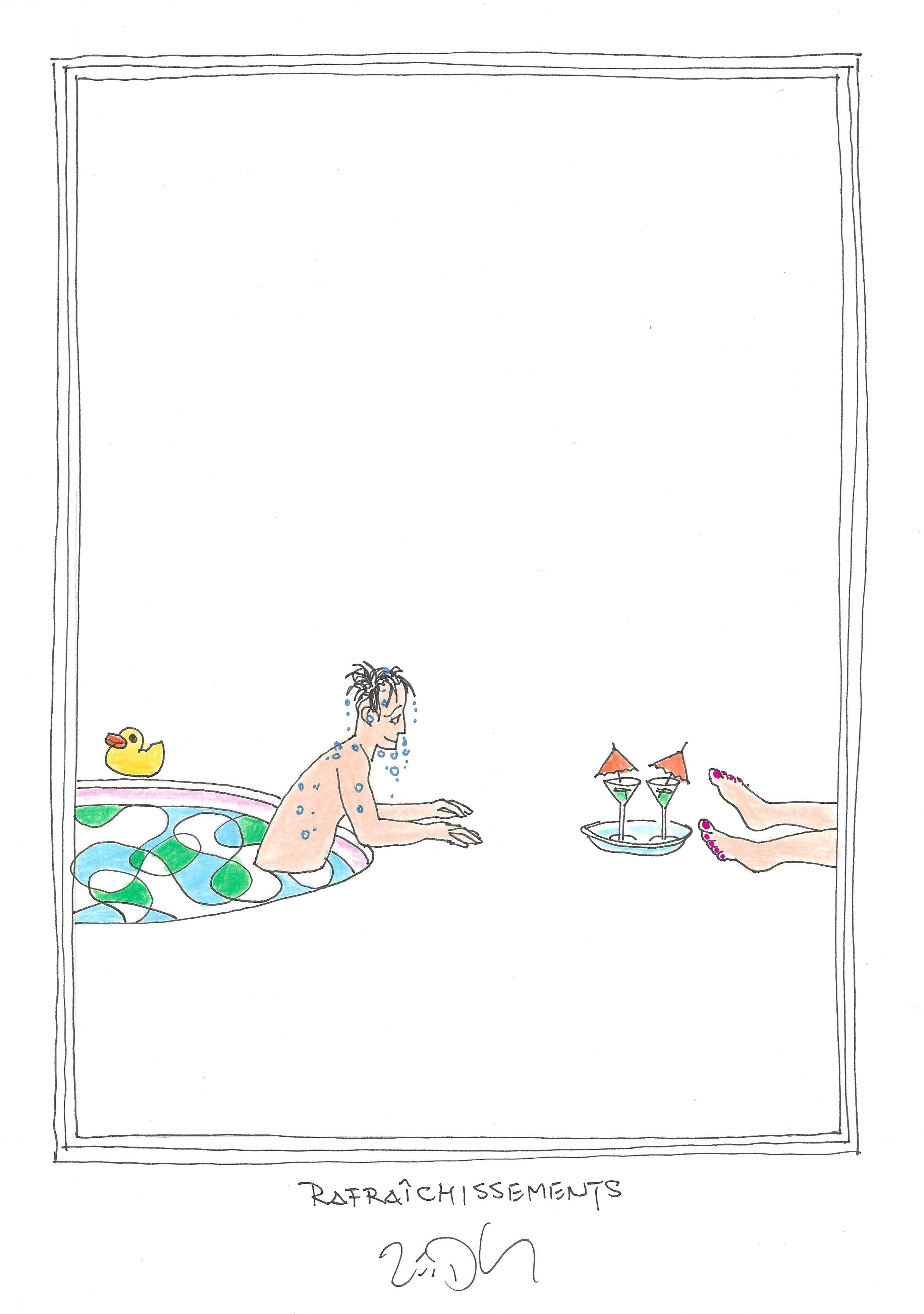 Drawing of the Day – 3602 – Dessin du jour « Refreshments – Rafraîchissements » Ink & colour on Paper – 8 x 12″ (21 x 30 cm) – Encre & couleurs sur Papier