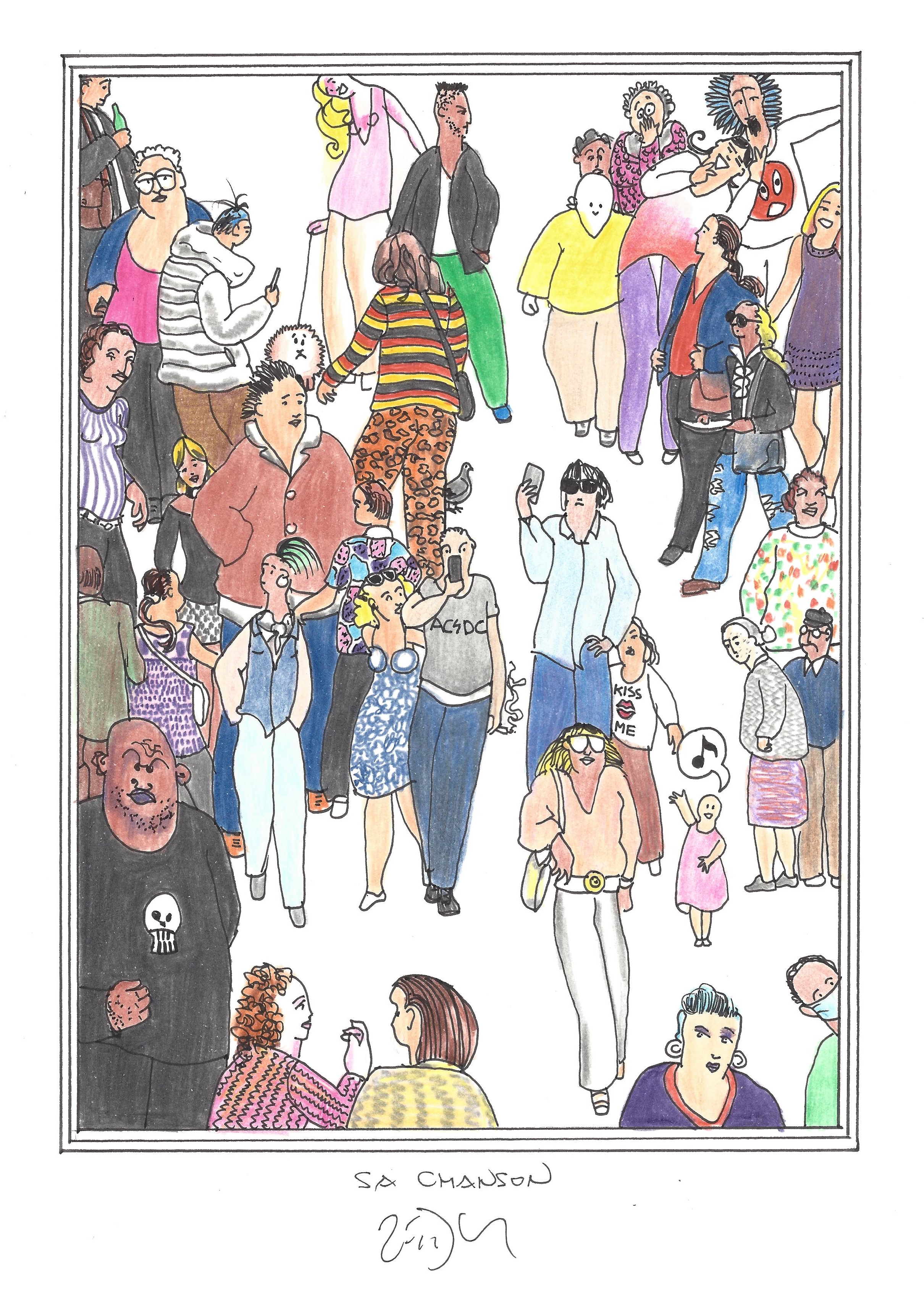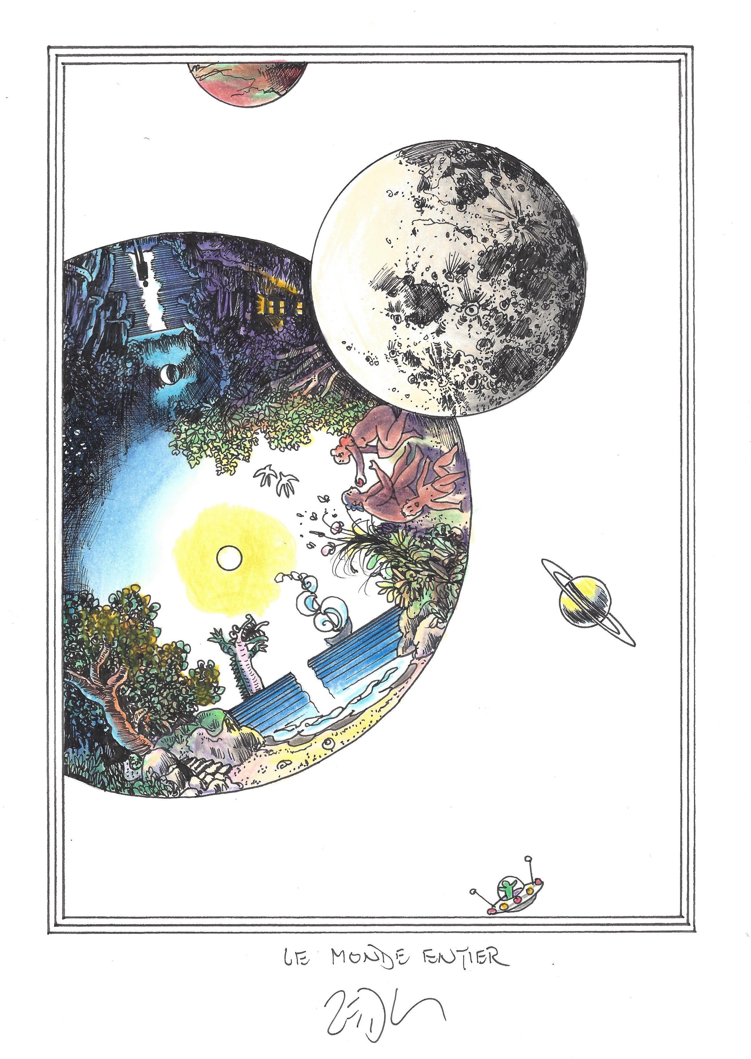Drawing of the Day – 2437 – Dessin du jour « The whole world – Le monde entier » Ink & color on Paper – 8 x 12″ (21 x 30 cm) – Encre & couleurs sur Papier