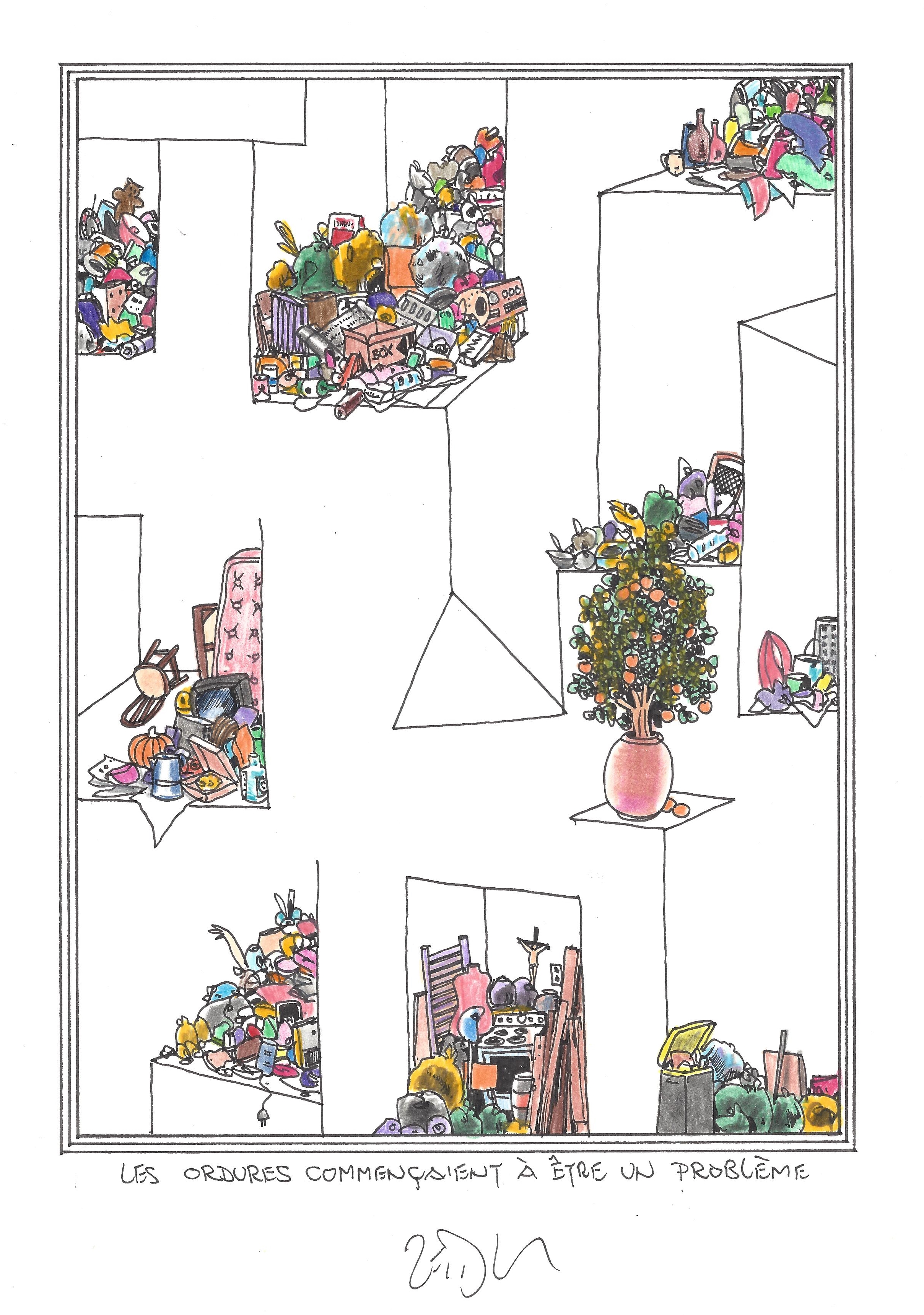 Drawing of the Day – 2434 – Dessin du jour « The garbage was getting to be a problem – Les ordures commençaient à être un problème » Ink & color on Paper – 8 x 12″ (21 x 30 cm) – Encre & couleurs sur Papier