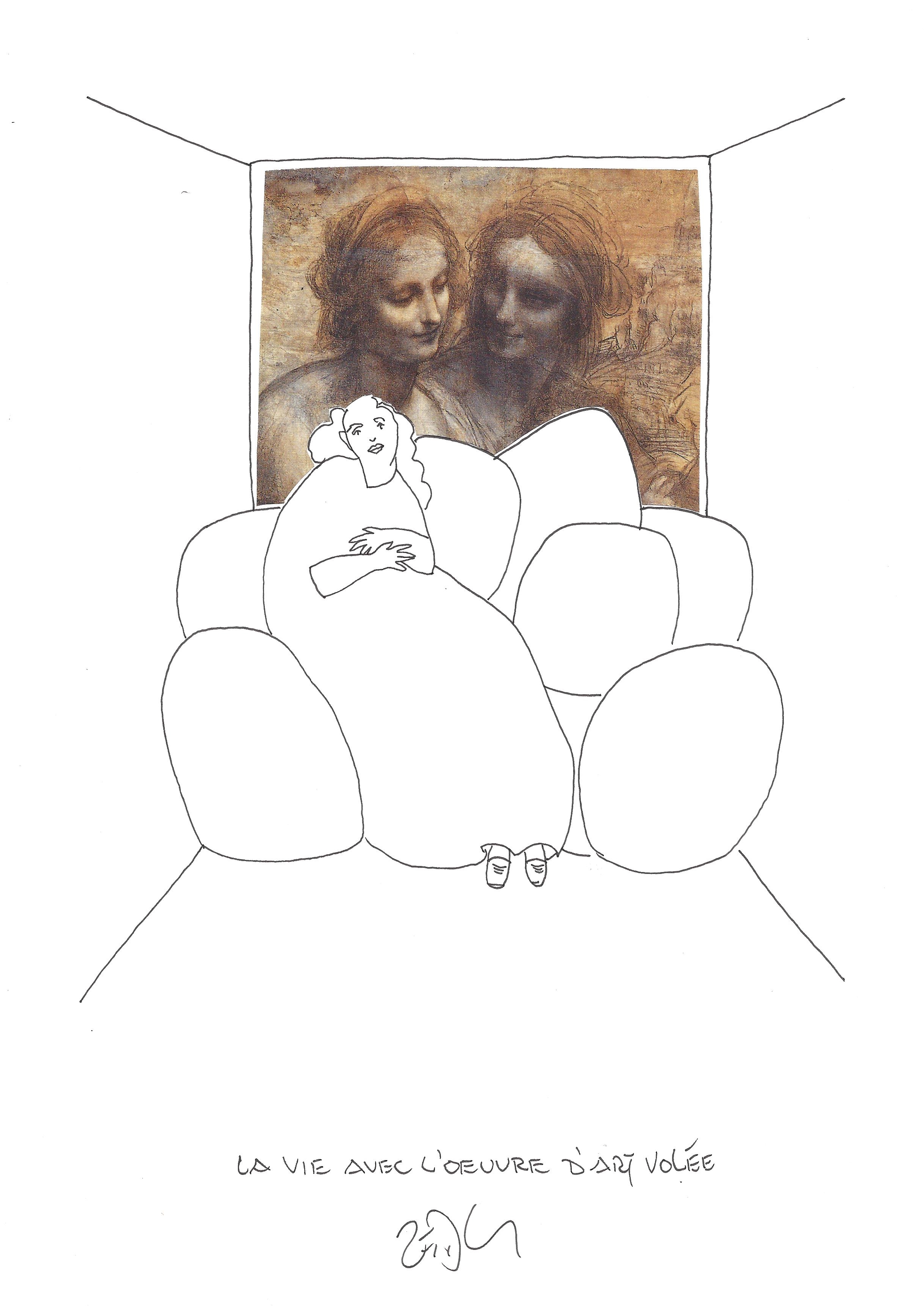 Drawing of the Day – 2436 – Dessin du jour « Living with stolen art – La vie avec l’œuvre d’art volée » Mixed Media on Paper – 8 x 12″ (21 x 30 cm) – Technique mixte sur Papier