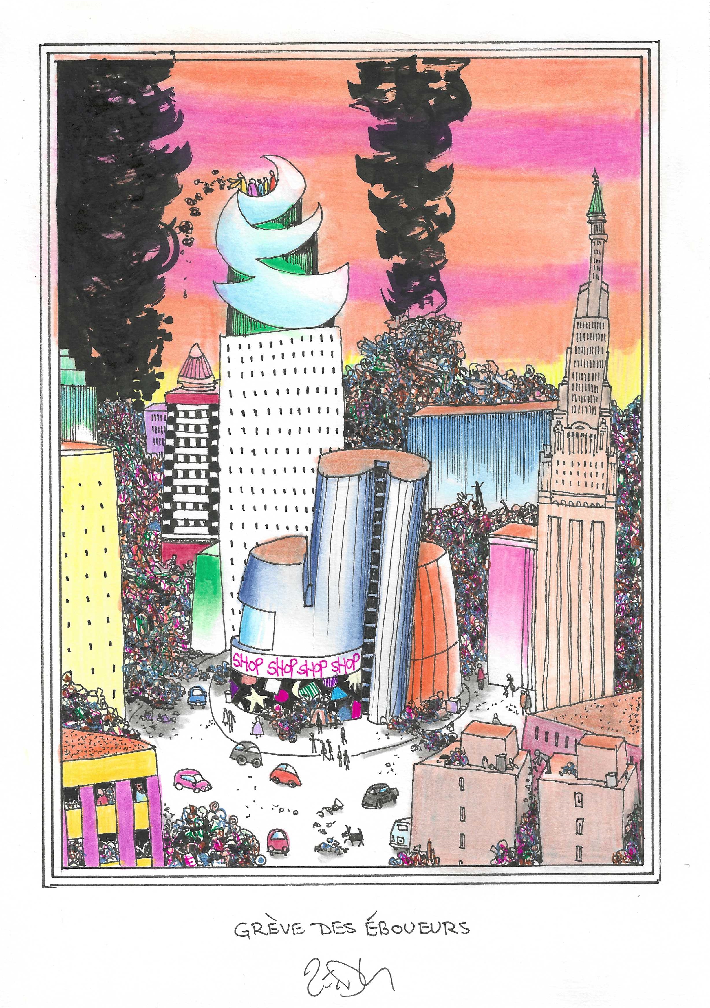 Drawing of the Day – 3554 – Dessin du jour « Garbage strike – Grève des éboueurs » Ink & colour on Paper – 8 x 12″ (21 x 30 cm) – Encre & couleurs sur Papier