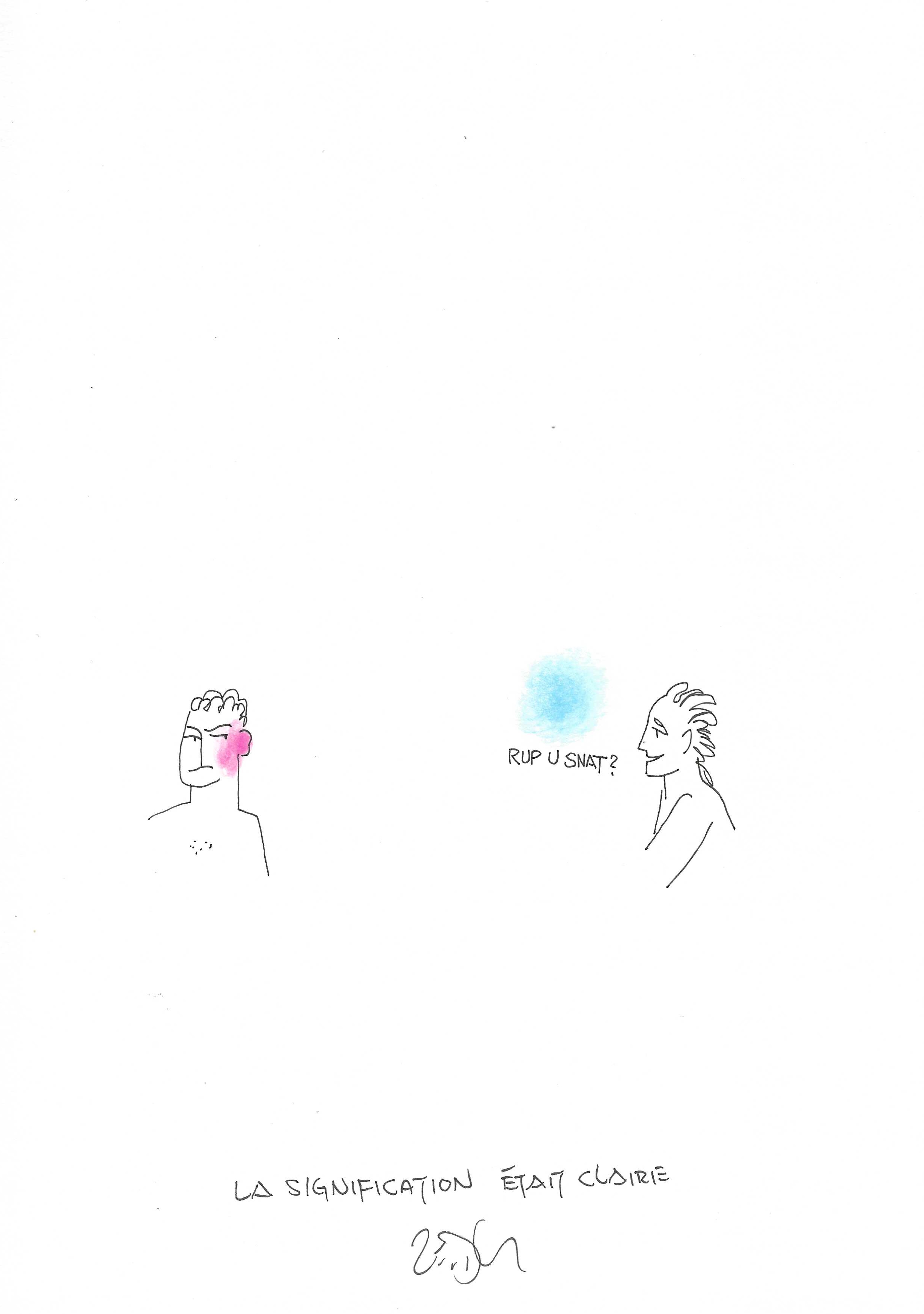 Drawing of the Day – 3555 – Dessin du jour « The meaning was clear – La signification était claire » Ink & colour on Paper – 8 x 12″ (21 x 30 cm) – Encre & couleurs sur Papier