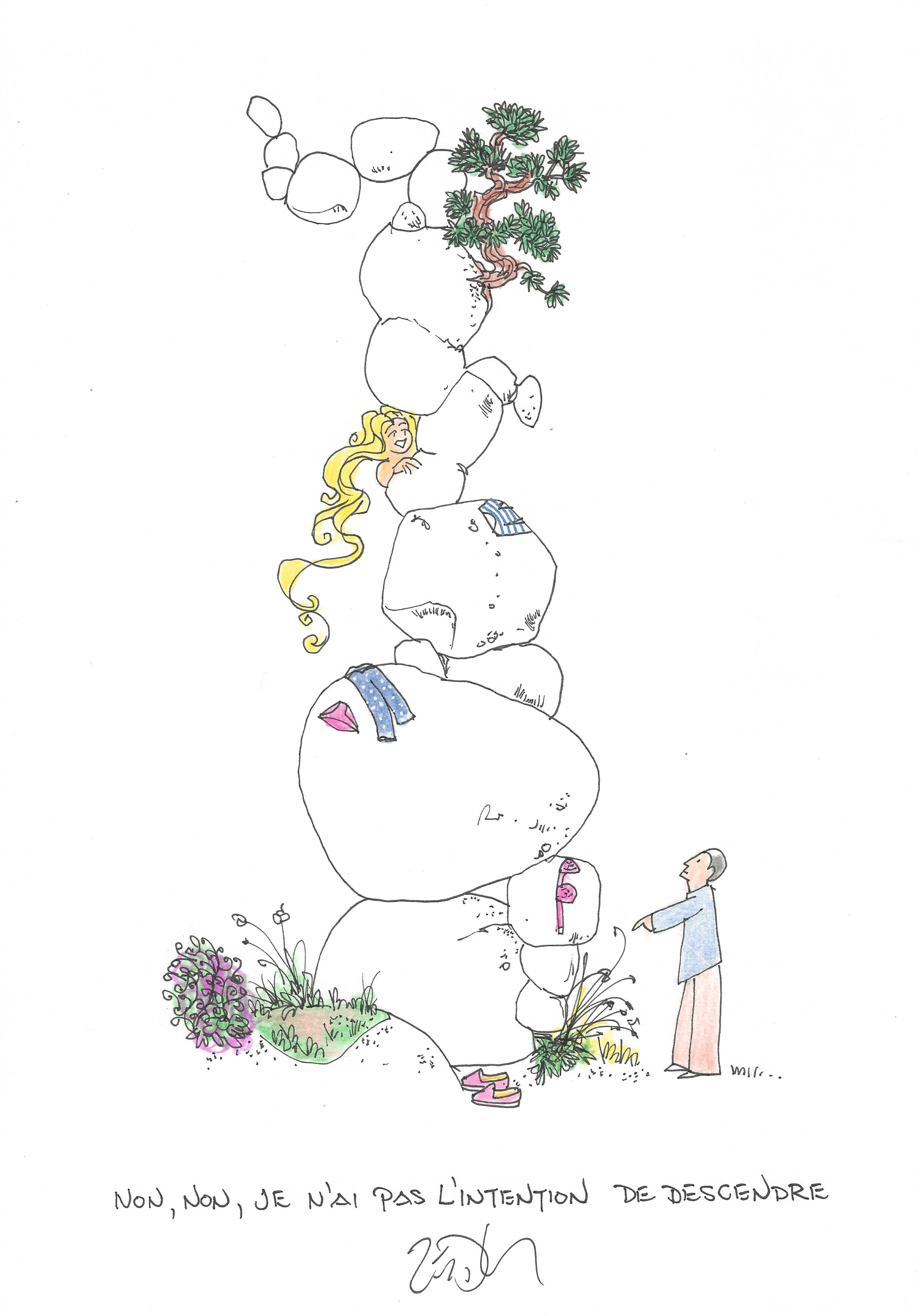 Drawing of the Day – 3556 – Dessin du jour « Nope, not coming down – Non, non, je n’ai pas l’intention de descendre » Ink & colour on Paper – 8 x 12″ (21 x 30 cm) – Encre & couleurs sur Papier
