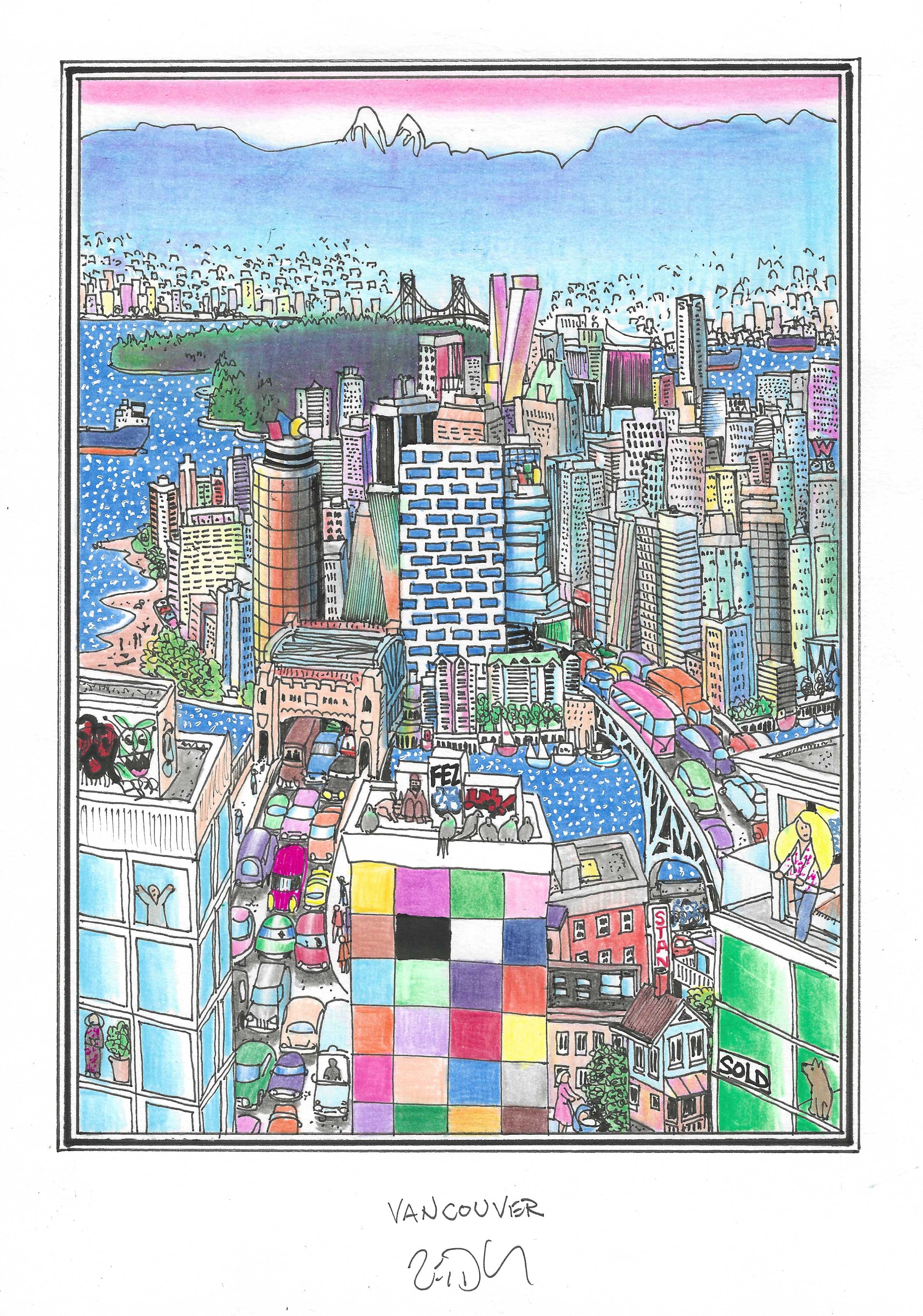 Drawing of the Day – 3557 – Dessin du jour « Vancouver » Ink & colour on Paper – 8 x 12″ (21 x 30 cm) – Encre & couleurs sur Papier