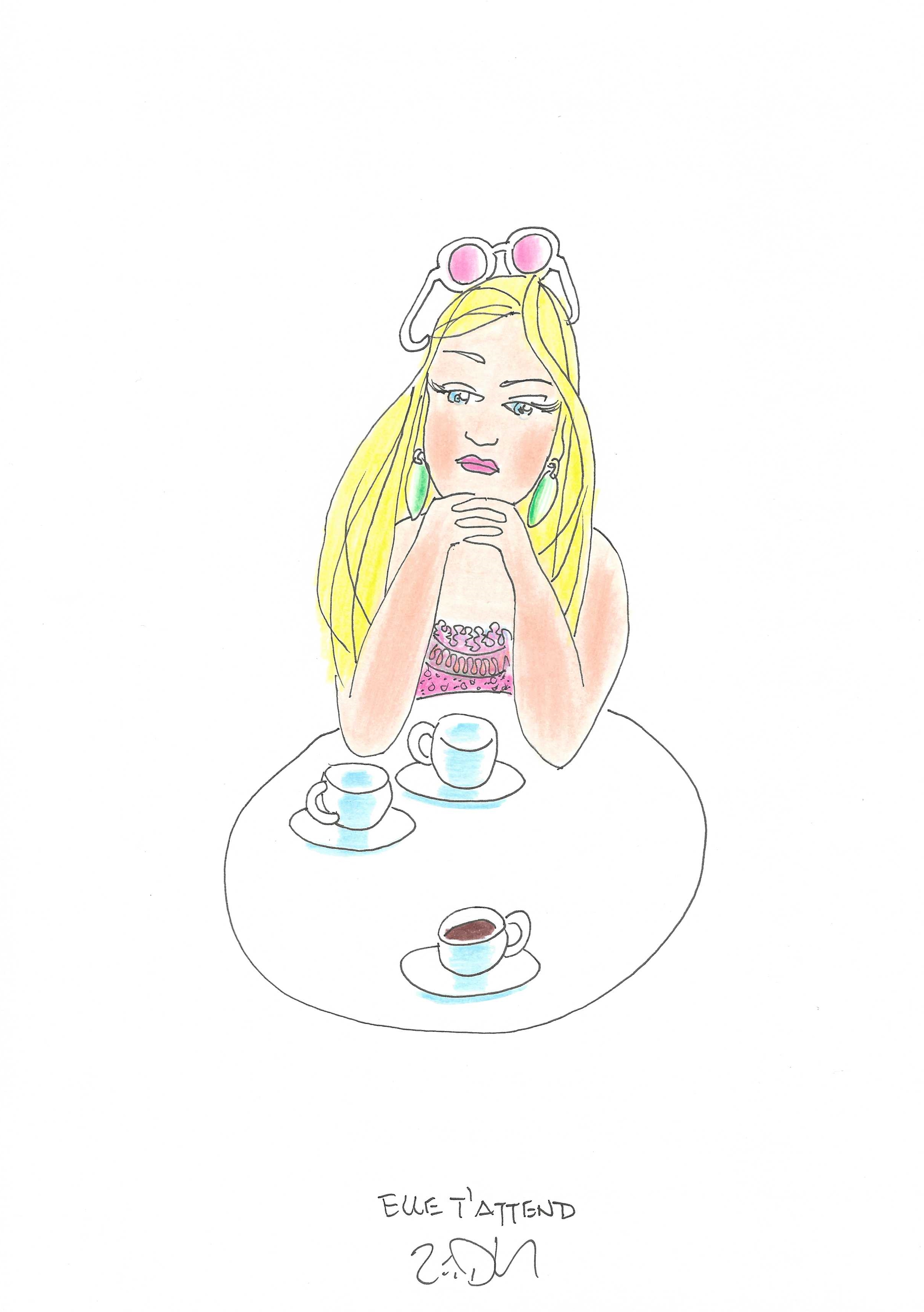 Drawing of the Day – 3558 – Dessin du jour « Waiting for you – Elle t’attend » Ink & colour on Paper – 8 x 12″ (21 x 30 cm) – Encre & couleurs sur Papier