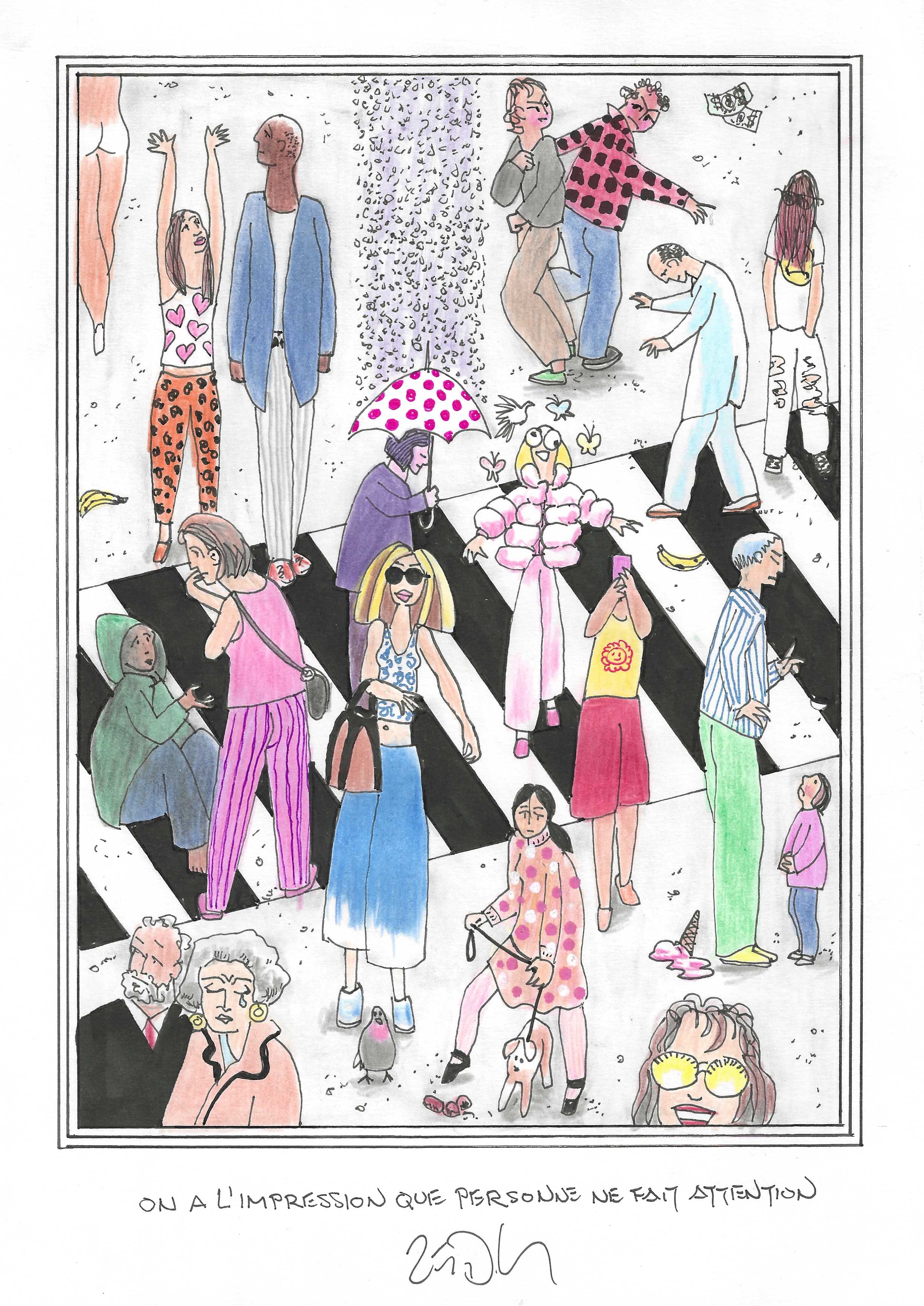 Drawing of the Day – 3559 – Dessin du jour « It seems nobody pays attention anymore – On a l’impression que personne ne fait attention » Ink & colour on Paper – 8 x 12″ (21 x 30 cm) – Encre & couleurs sur Papier