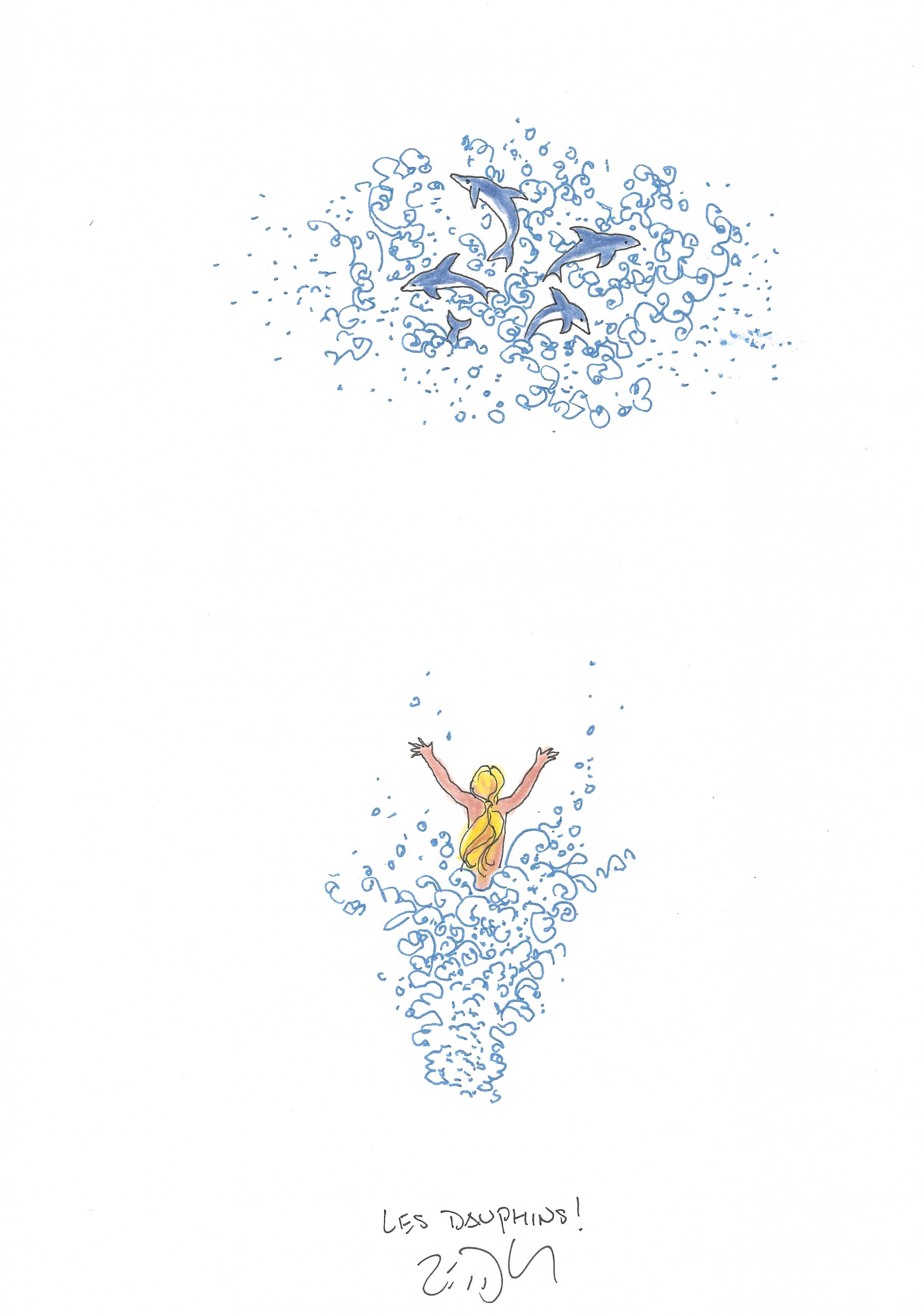 Drawing of the Day – 3560 – Dessin du jour « Dolphins ! – Les Dauphins ! » Ink & colour on Paper – 8 x 12″ (21 x 30 cm) – Encre & couleurs sur Papier