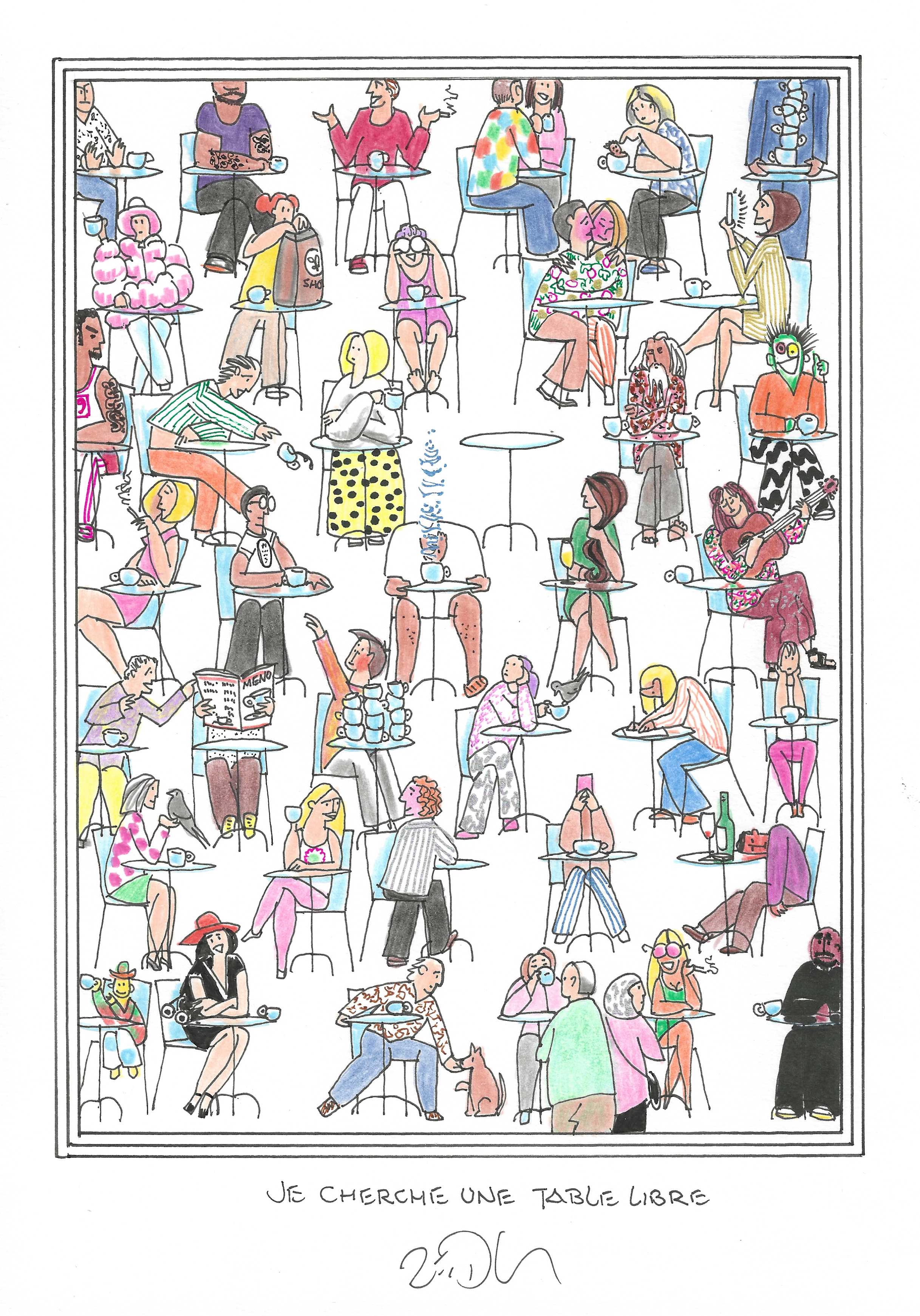 Drawing of the Day – 3561 – Dessin du jour « Looking for a table – Je cherche une table libre » Ink & colour on Paper – 8 x 12″ (21 x 30 cm) – Encre & couleurs sur Papier