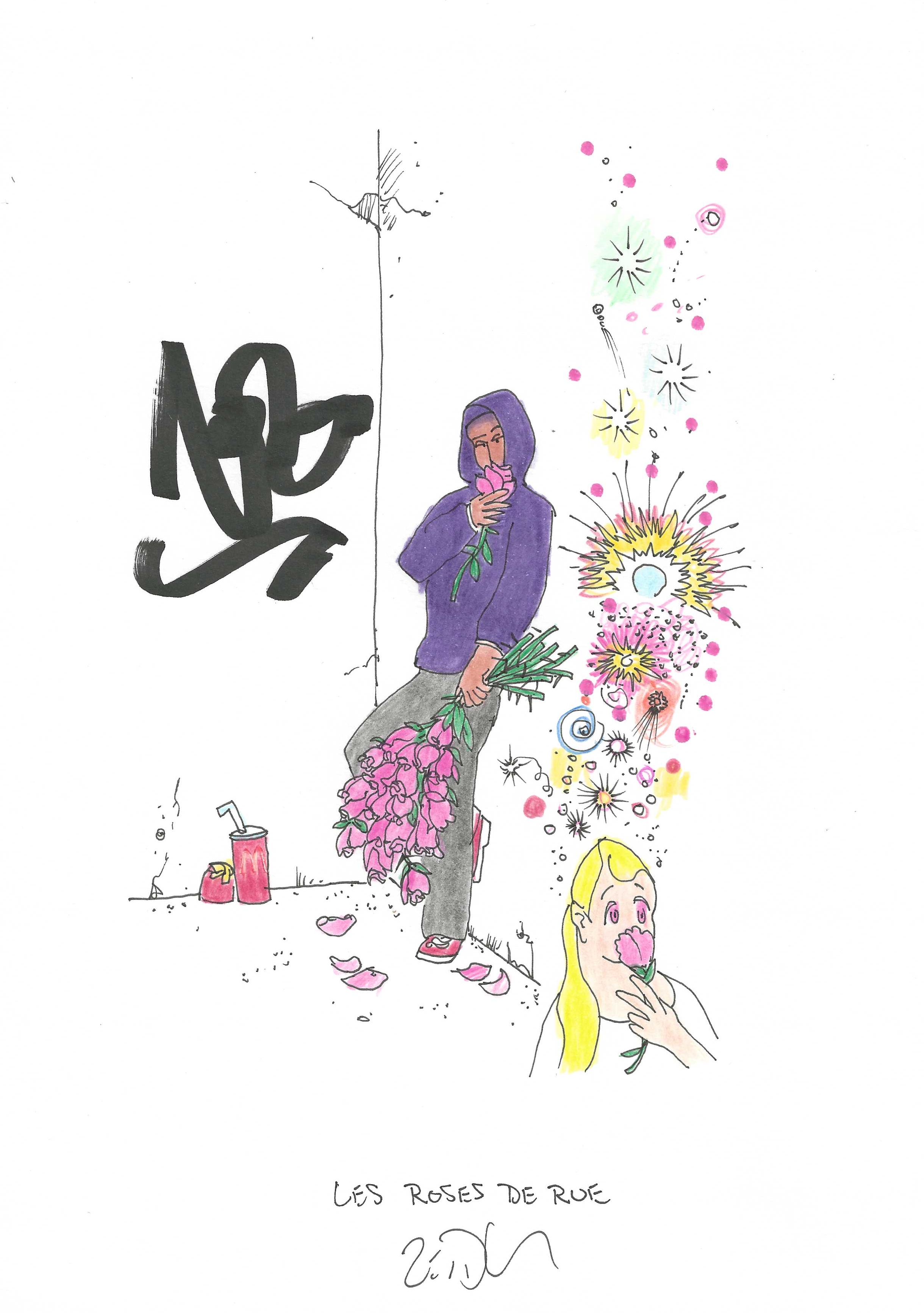 Drawing of the Day – 3562 – Dessin du jour « Street roses – Les roses de rue » Ink & colour on Paper – 8 x 12″ (21 x 30 cm) – Encre & couleurs sur Papier