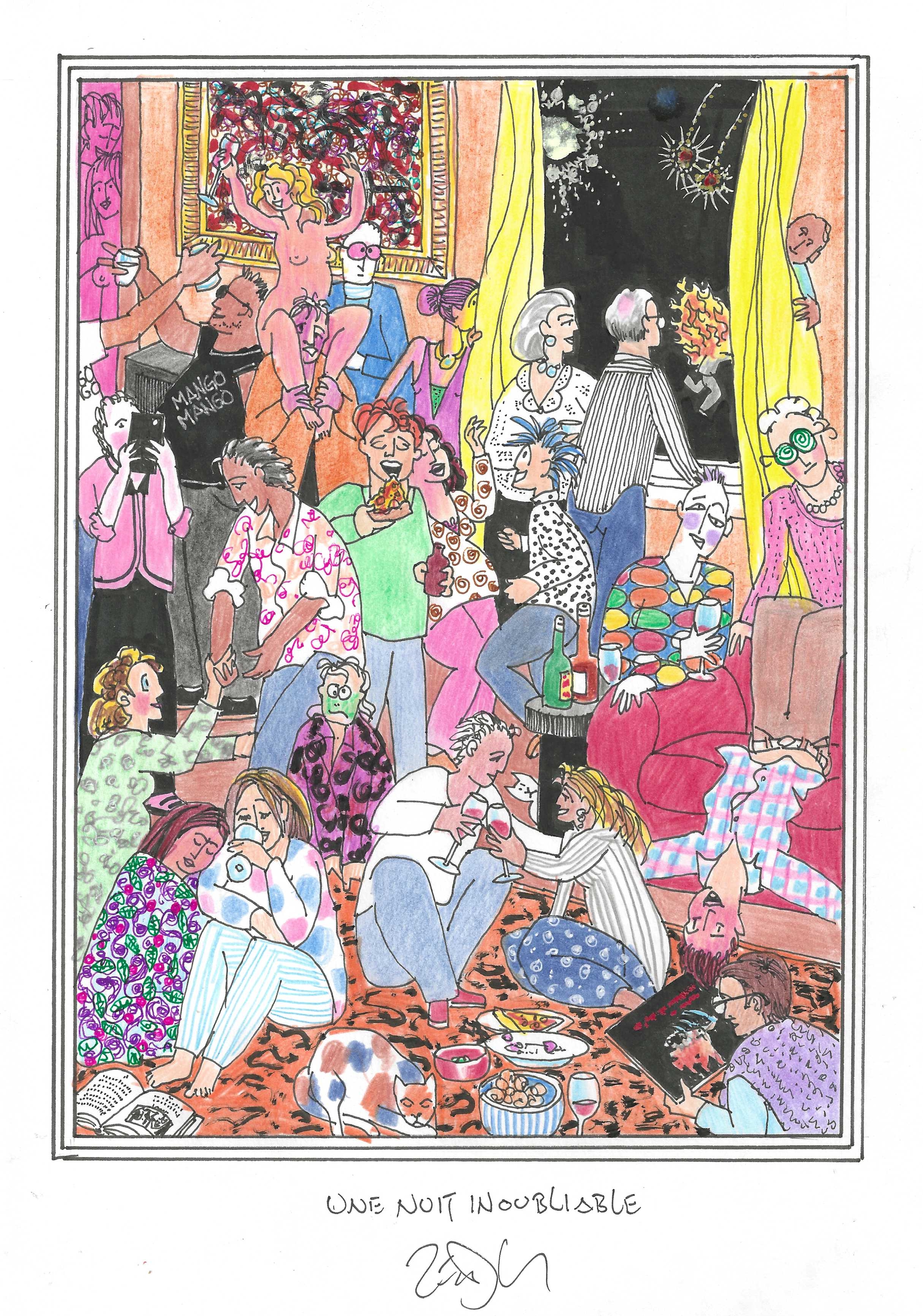 Drawing of the Day – 3414 – Dessin du jour « A night to remember – Une nuit inoubliable » Ink & colour on Paper – 8 x 12″ (21 x 30 cm) – Encre & couleurs sur Papier