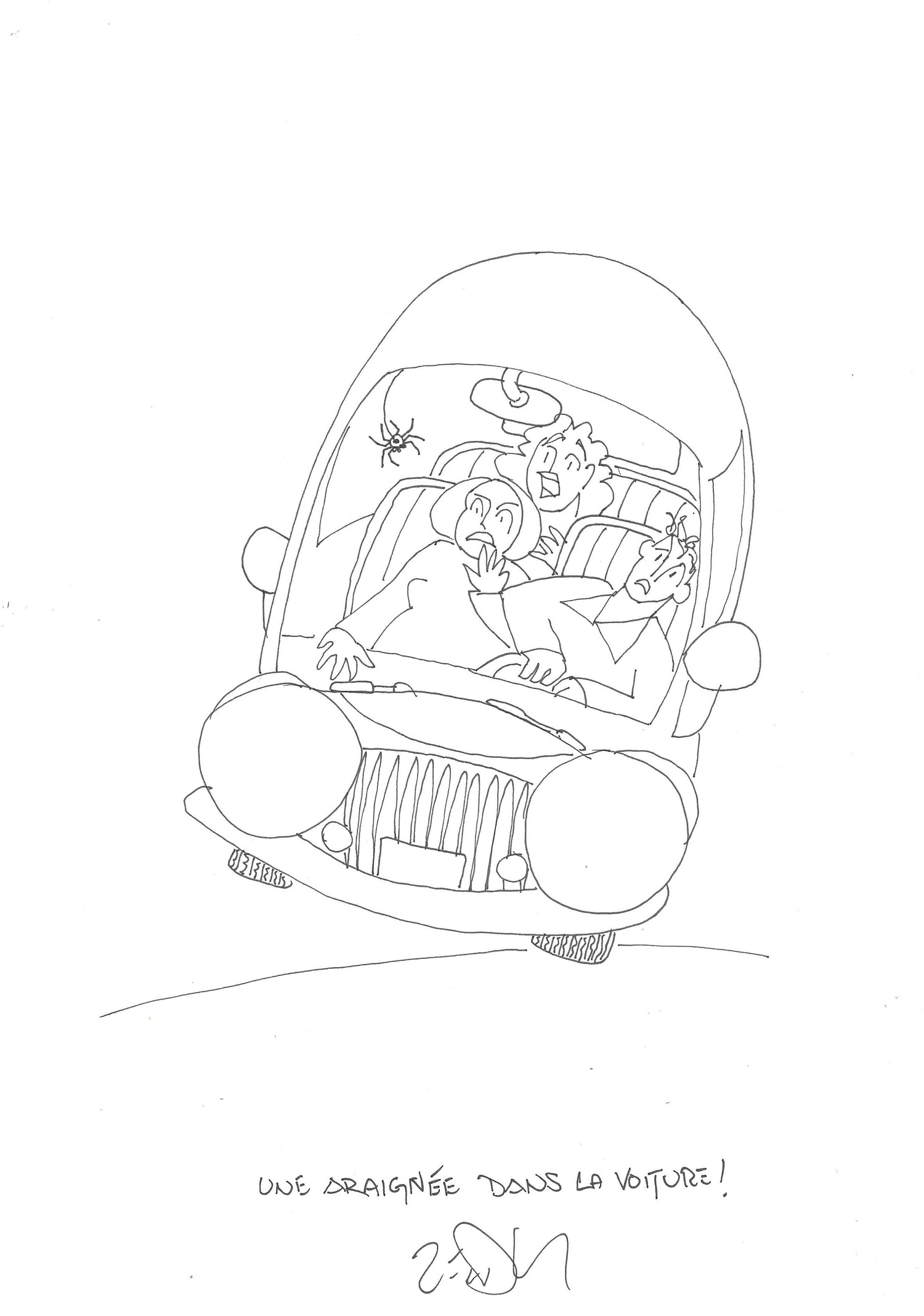 Drawing of the Day – 3415 – Dessin du jour « Spider in the car ! – Une araignée dans la voiture ! » Ink on Paper – 8 x 12″ (21 x 30 cm) – Encre sur Papier