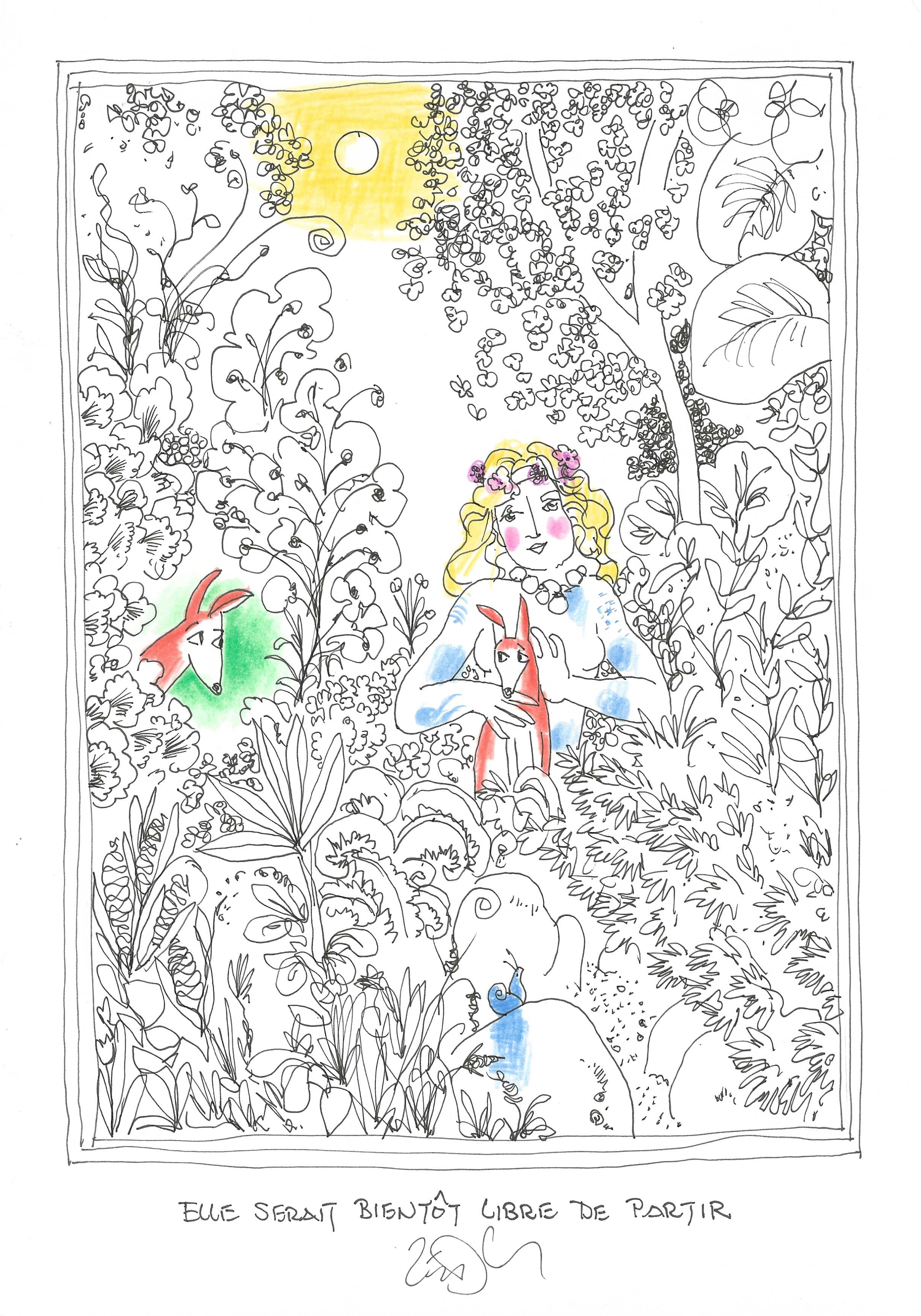 Drawing of the Day – 3418 – Dessin du jour « Soon she would be free to go – Elle serait bientôt libre de partir » Ink & colour on Paper – 8 x 12″ (21 x 30 cm) – Encre & couleurs sur Papier