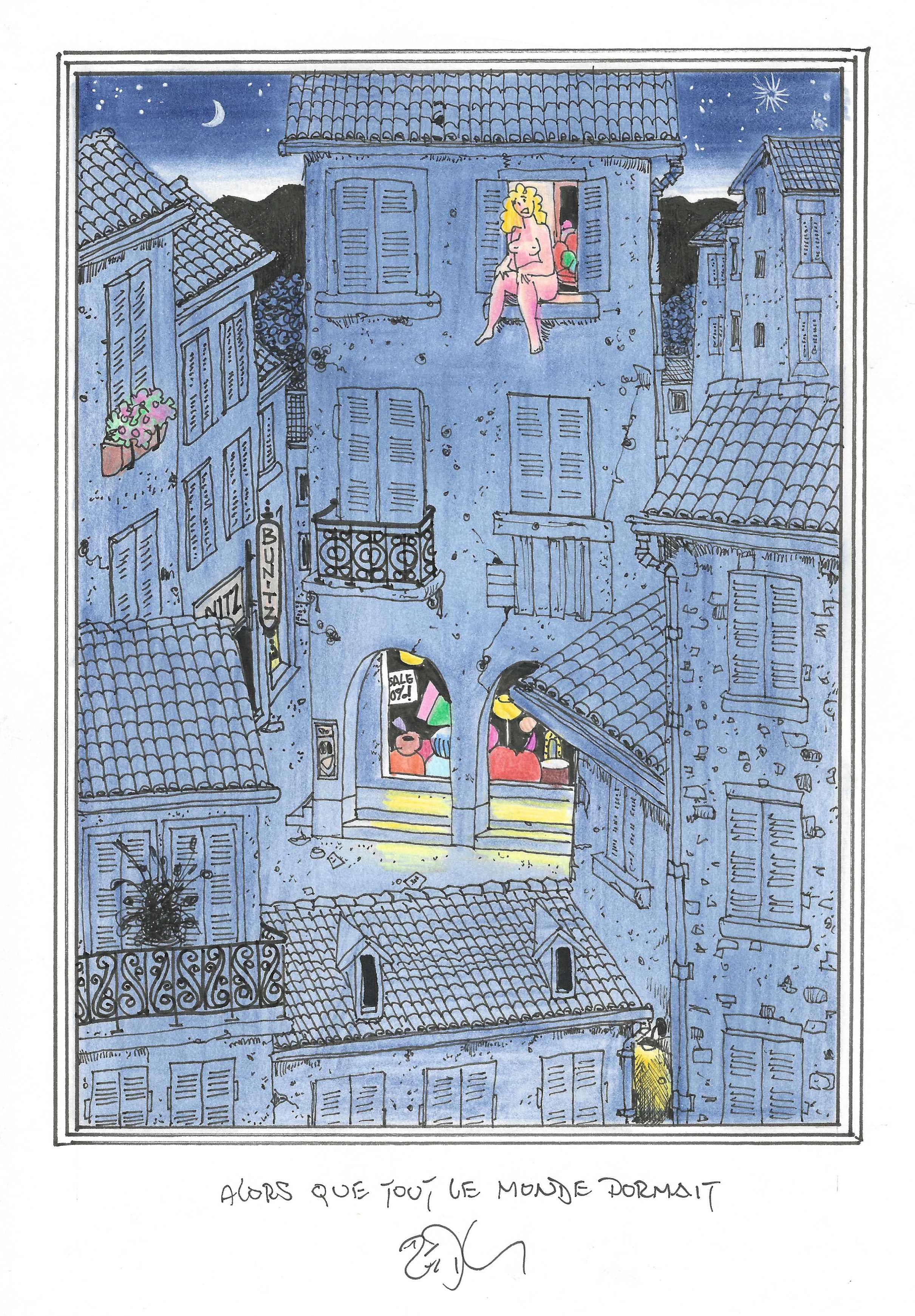 Drawing of the Day – 3421 – Dessin du jour « While everyone slept – Alors que tout le monde dormait » Ink & colour on Paper – 8 x 12″ (21 x 30 cm) – Encre & couleurs sur Papier