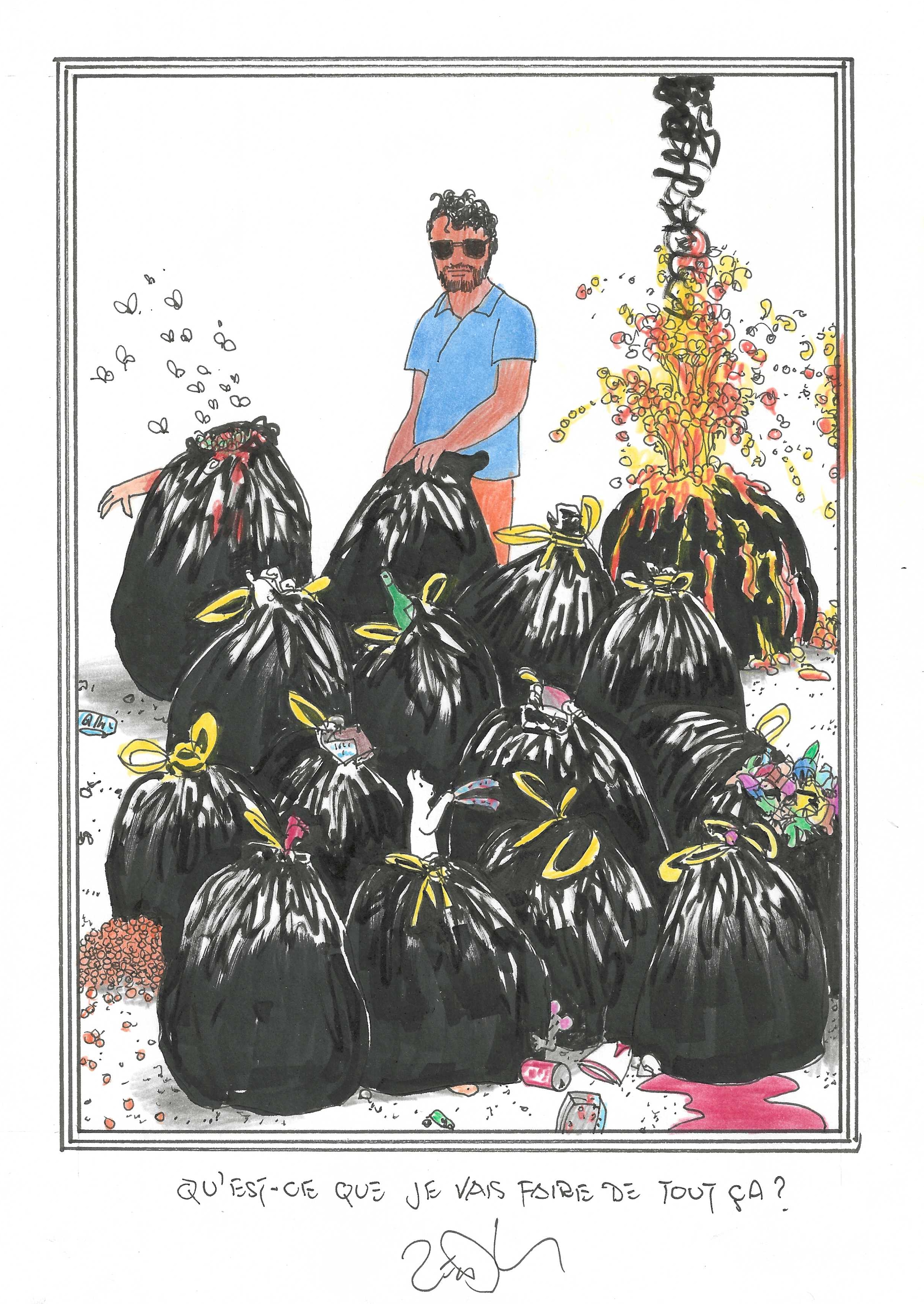 Drawing of the Day – 3406 – Dessin du jour « What am I going to do with all this ? – Qu’est-ce que je vais faire de tout ça ? » Ink & colour on Paper – 8 x 12″ (21 x 30 cm) – Encre & couleurs sur Papier