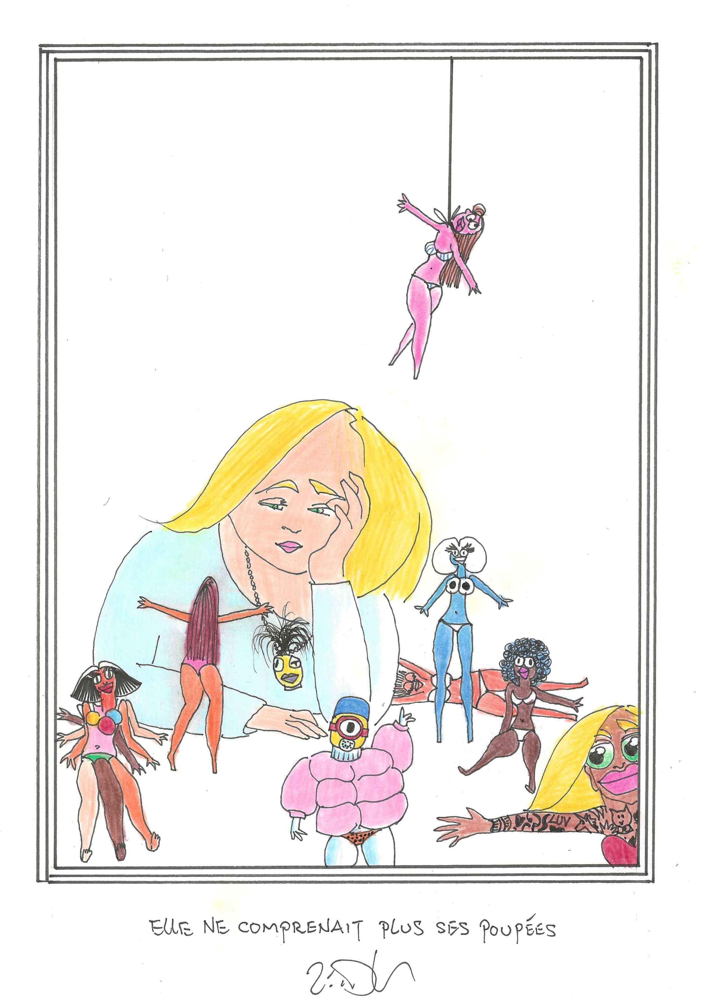 Drawing of the Day – 3408 – Dessin du jour « She no longer understood her dolls – Elle ne comprenait plus ses poupées » Ink & colour on Paper – 8 x 12″ (21 x 30 cm) – Encre & couleurs sur Papier