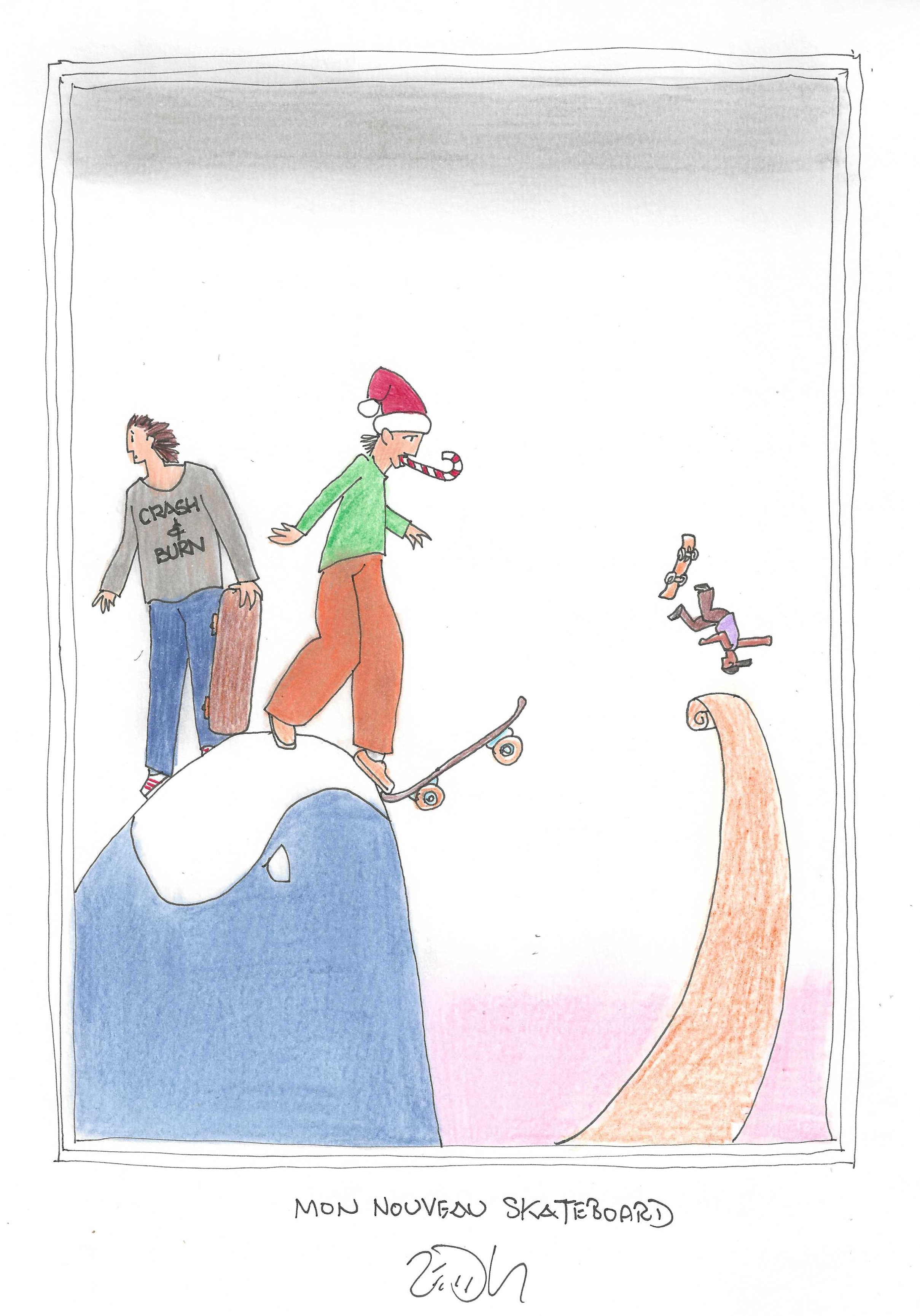 Drawing of the Day – 3410 – Dessin du jour « My new skateboard – Mon nouveau skateboard » Ink & colour on Paper – 8 x 12″ (21 x 30 cm) – Encre & couleurs sur Papier