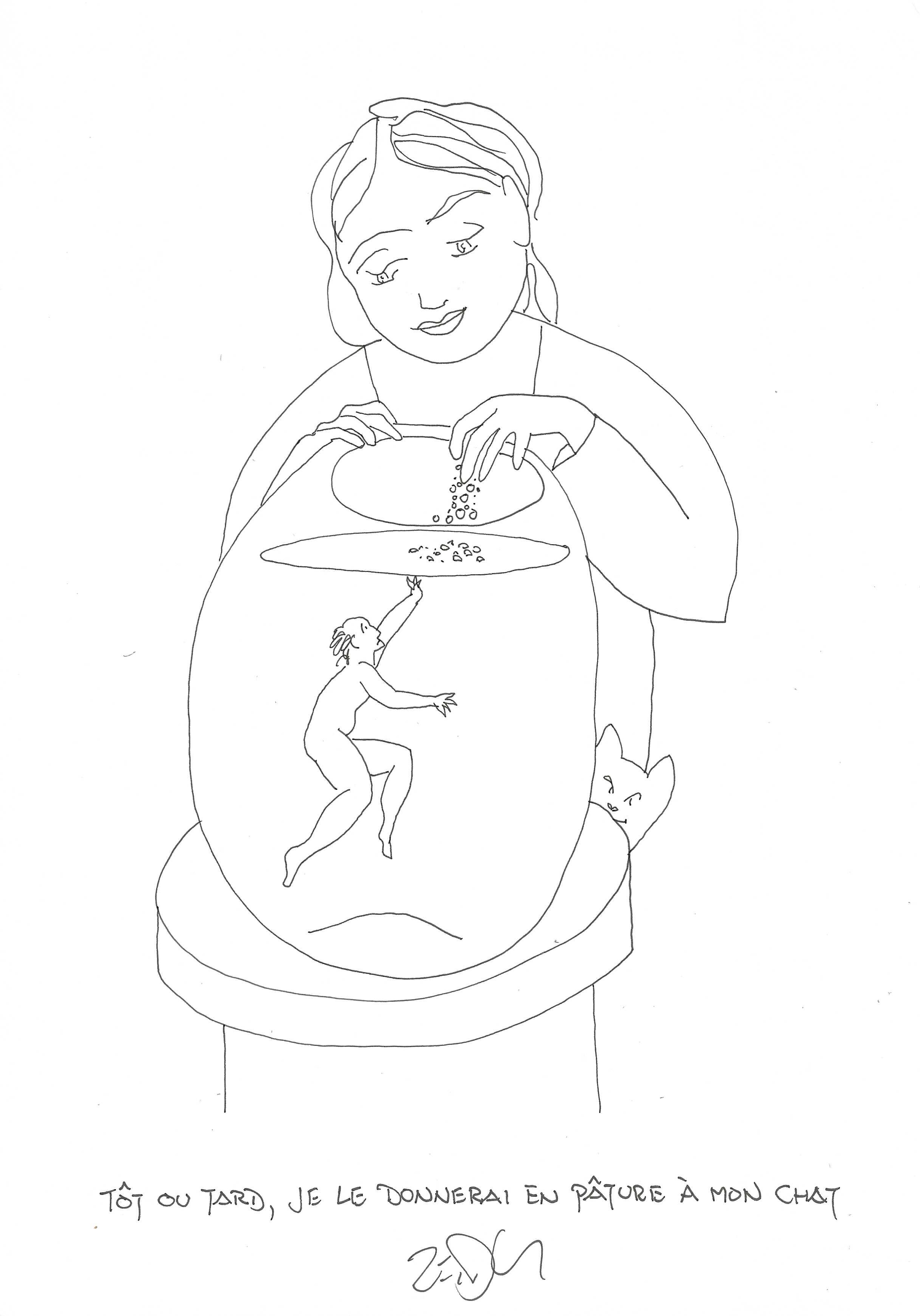 Drawing of the Day – 3411 – Dessin du jour « Eventually, I’ll feed him to my cat – Tôt ou tard, je le donnerai en pâture à mon chat » Ink on Paper – 8 x 12″ (21 x 30 cm) – Encre sur Papier