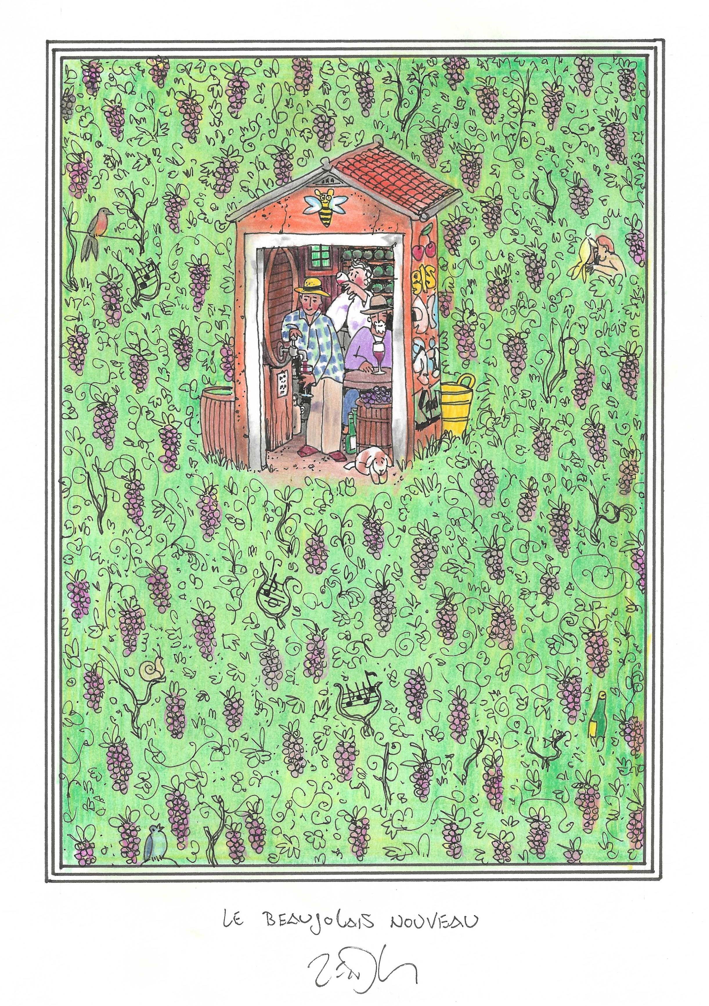 Drawing of the Day – 3385 – Dessin du jour « Le Beaujolais Nouveau » Ink & colour on Paper – 8 x 12″ (21 x 30 cm) – Encre & couleurs sur Papier