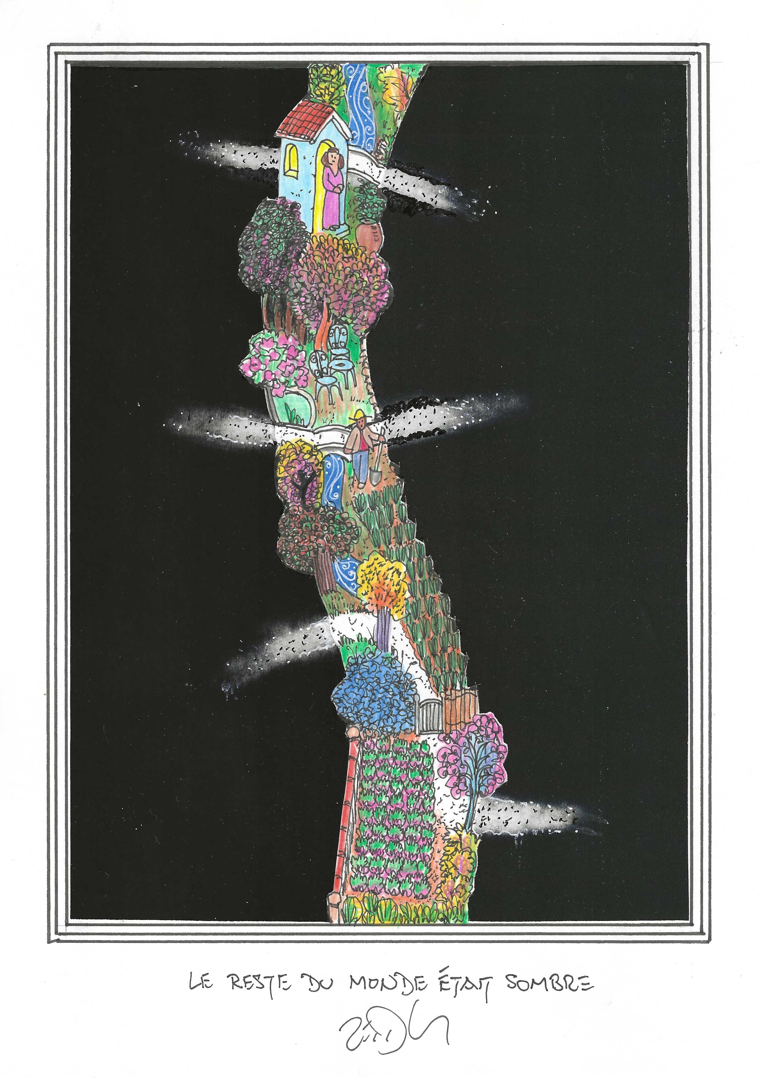 Drawing of the Day – 3386 – Dessin du jour « The rest of the world was dark – Le reste du monde était sombre » Mixed Media on Paper – 8 x 12″ (21 x 30 cm) – Technique mixte sur Papier