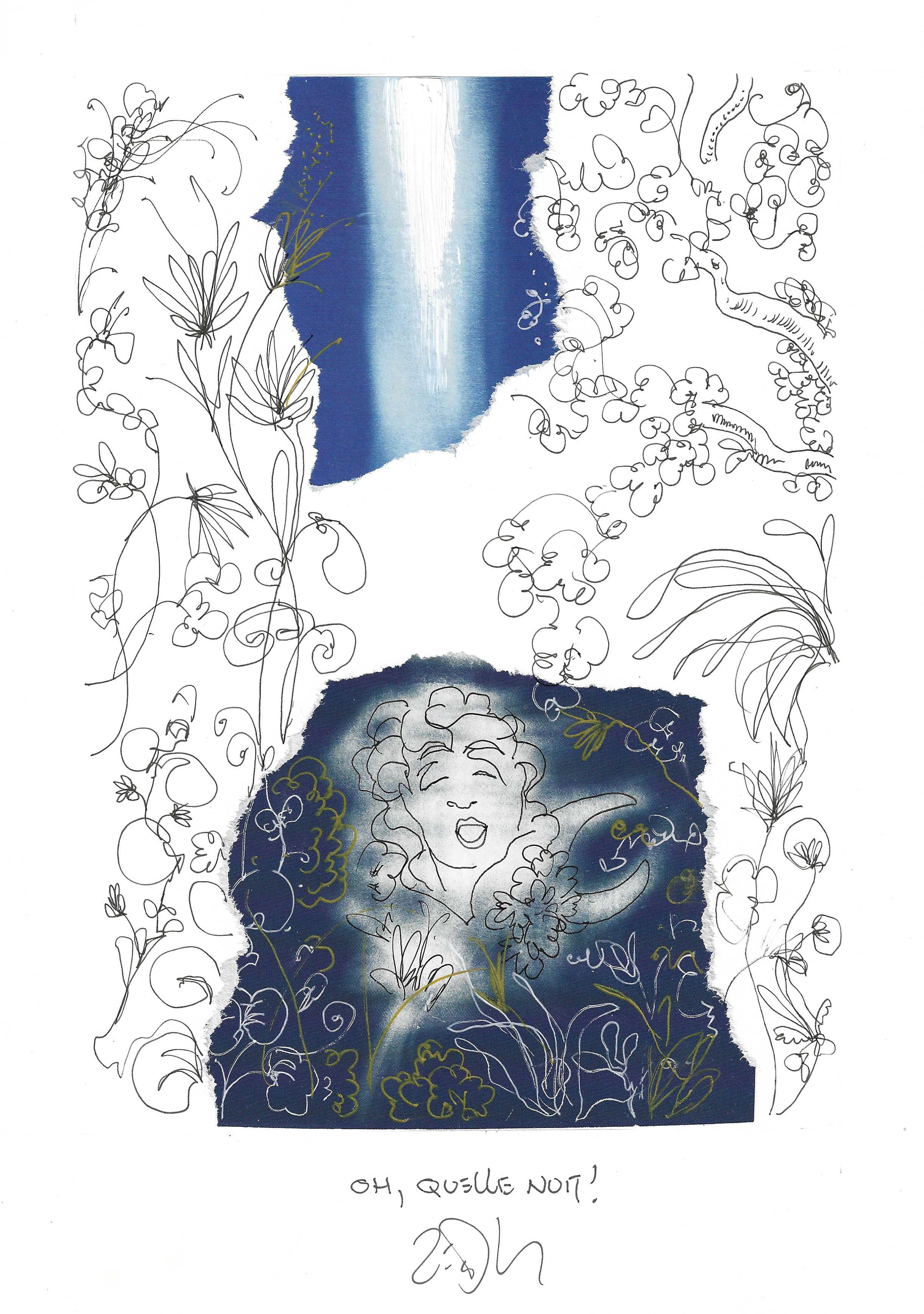 Drawing of the Day – 3387 – Dessin du jour « Oh, what a night ! – Oh, quelle nuit ! » Mixed Media on Paper – 8 x 12″ (21 x 30 cm) – Technique mixte sur Papier