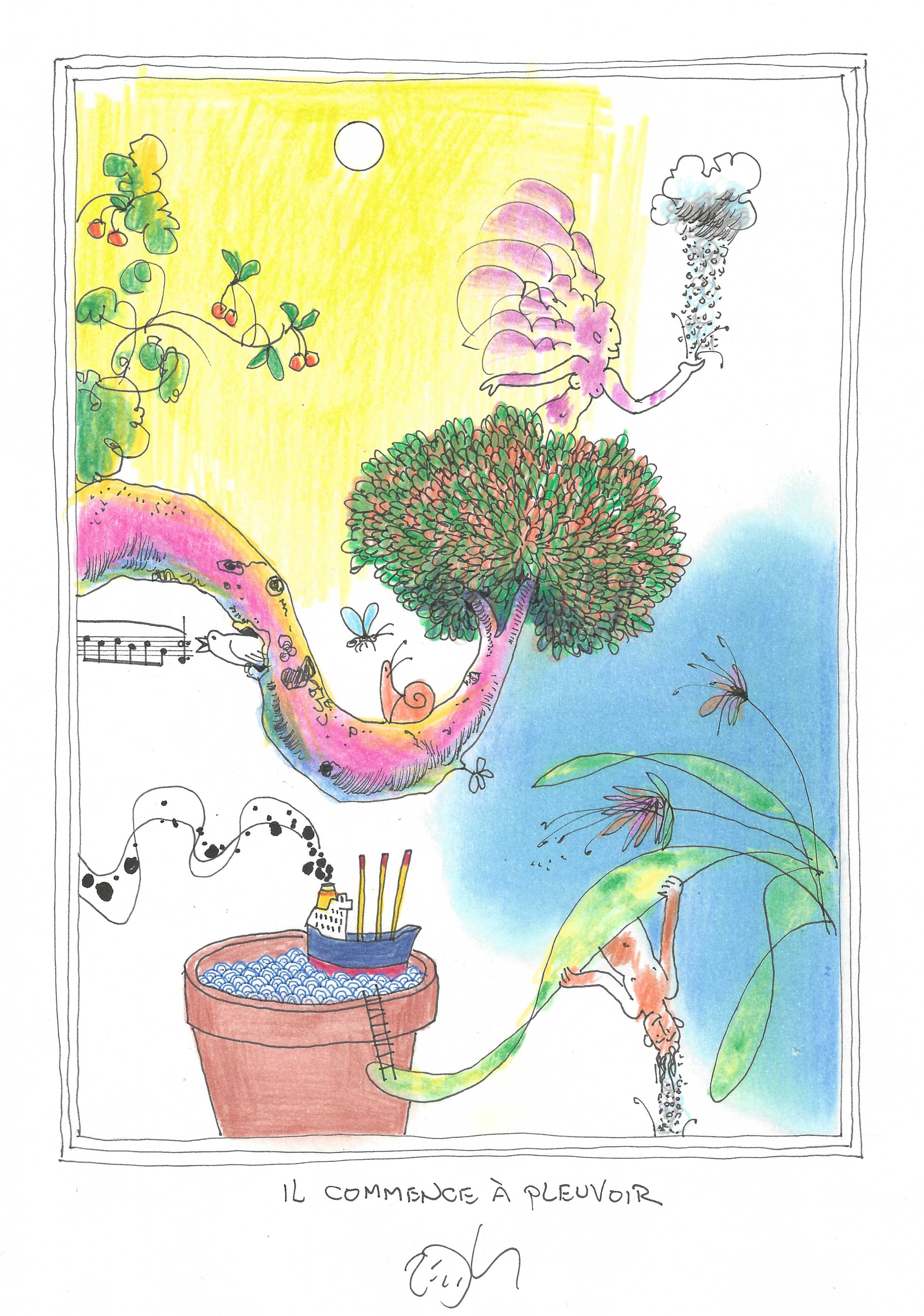 Drawing of the Day – 3388 – Dessin du jour « Starting to rain – Il commence à pleuvoir » Ink & colour on Paper – 8 x 12″ (21 x 30 cm) – Encre & couleurs sur Papier