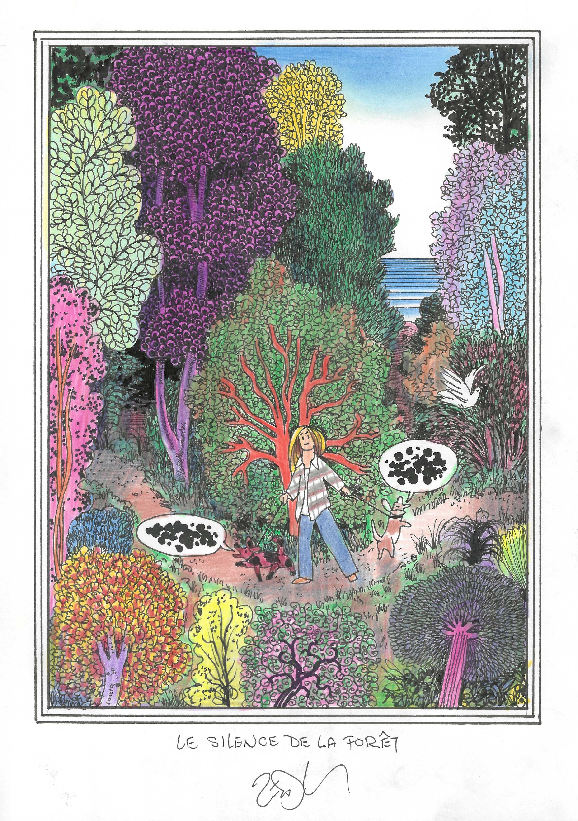 Drawing of the Day – 3389 – Dessin du jour « The silence of the forest – Le silence de la forêt » Ink & colour on Paper – 8 x 12″ (21 x 30 cm) – Encre & couleurs sur Papier