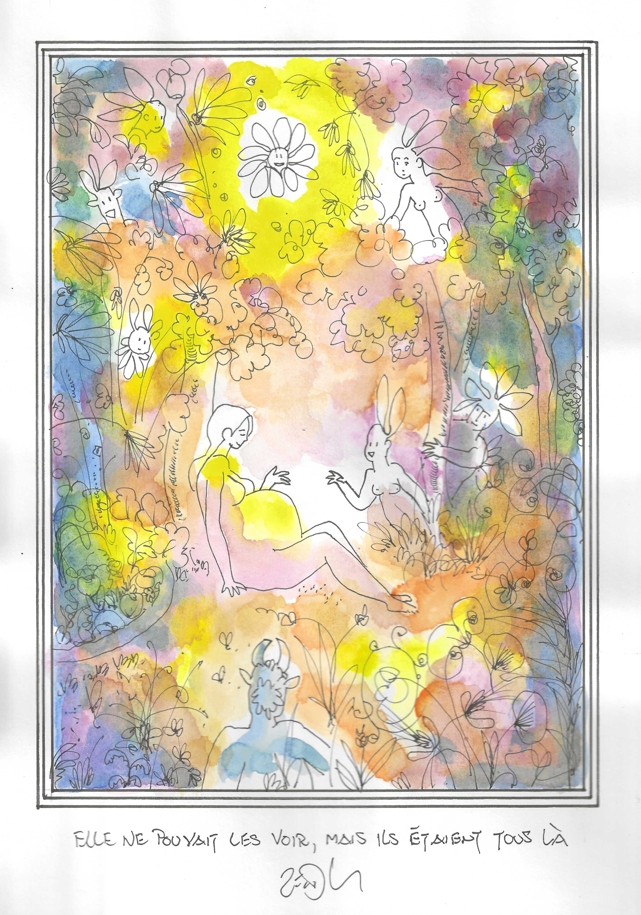 Drawing of the Day – 3392 – Dessin du jour « She couldn’t see them, but they were all there – Elle ne pouvait les voir, mais ils étaient tous là » Ink & watercolour on Paper – 8 x 12″ (21 x 30 cm) – Encre & aquarelle sur Papier