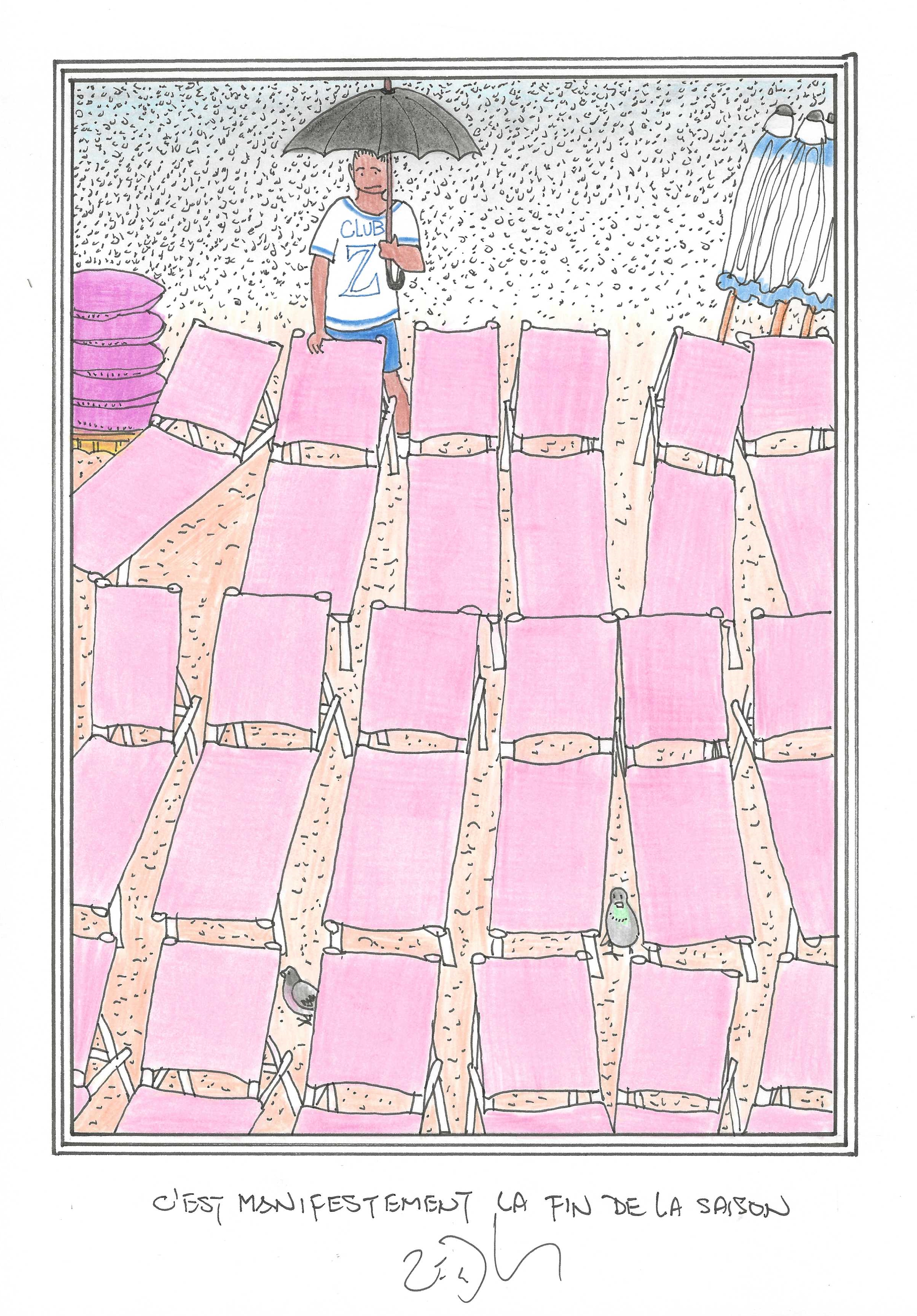 Drawing of the Day – 3394 – Dessin du jour « Definitely the end of the season – C’est manifestement la fin de la saison » Ink & colour on Paper – 8 x 12″ (21 x 30 cm) – Encre & couleurs sur Papier