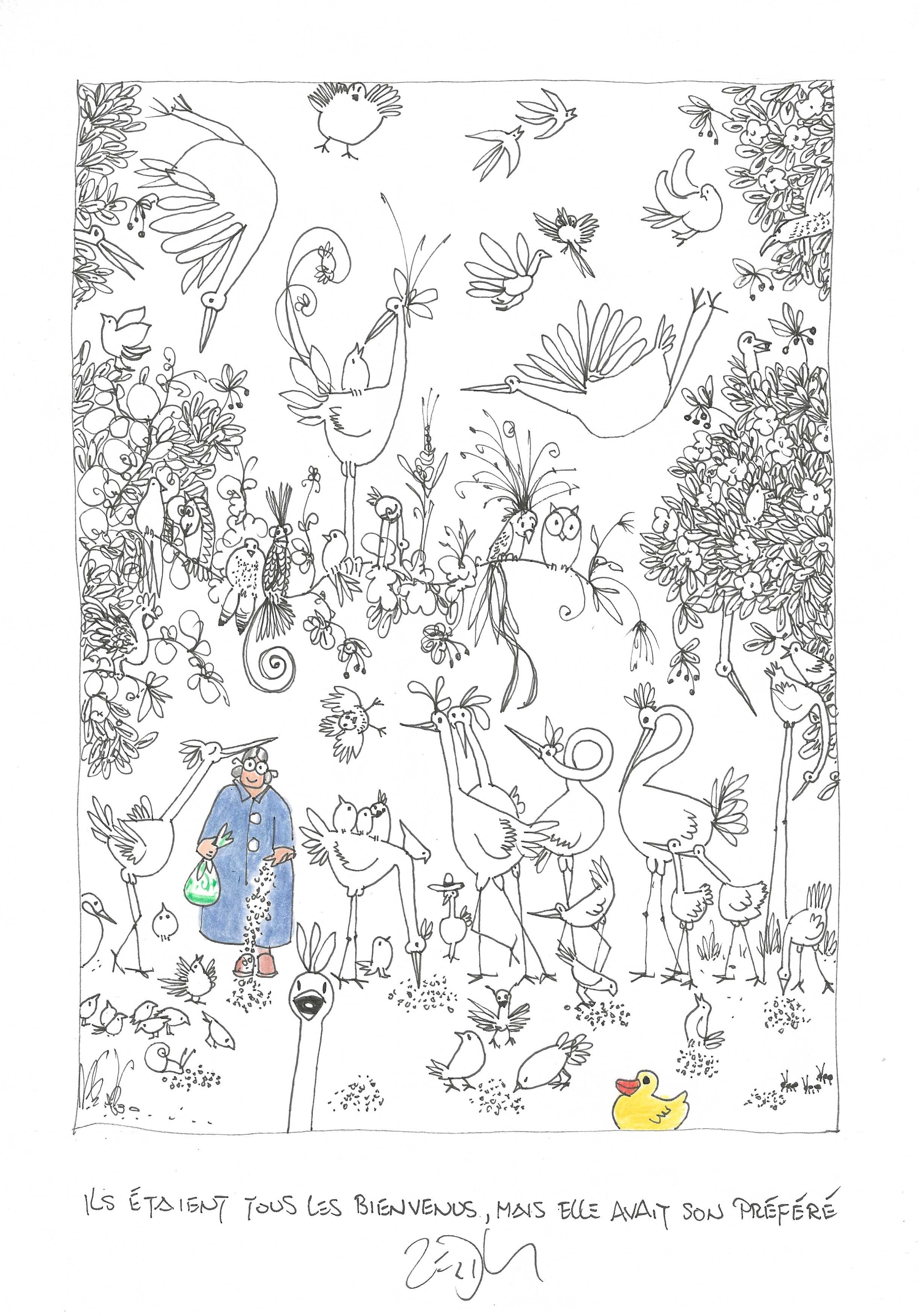 Drawing of the Day – 3365 – Dessin du jour « All were welcome, but she did have her favourite – Ils étaient tous les bienvenus, mais elle avait son préféré » Ink & colour on Paper – 8 x 12″ (21 x 30 cm) – Encre & couleurs sur Papier