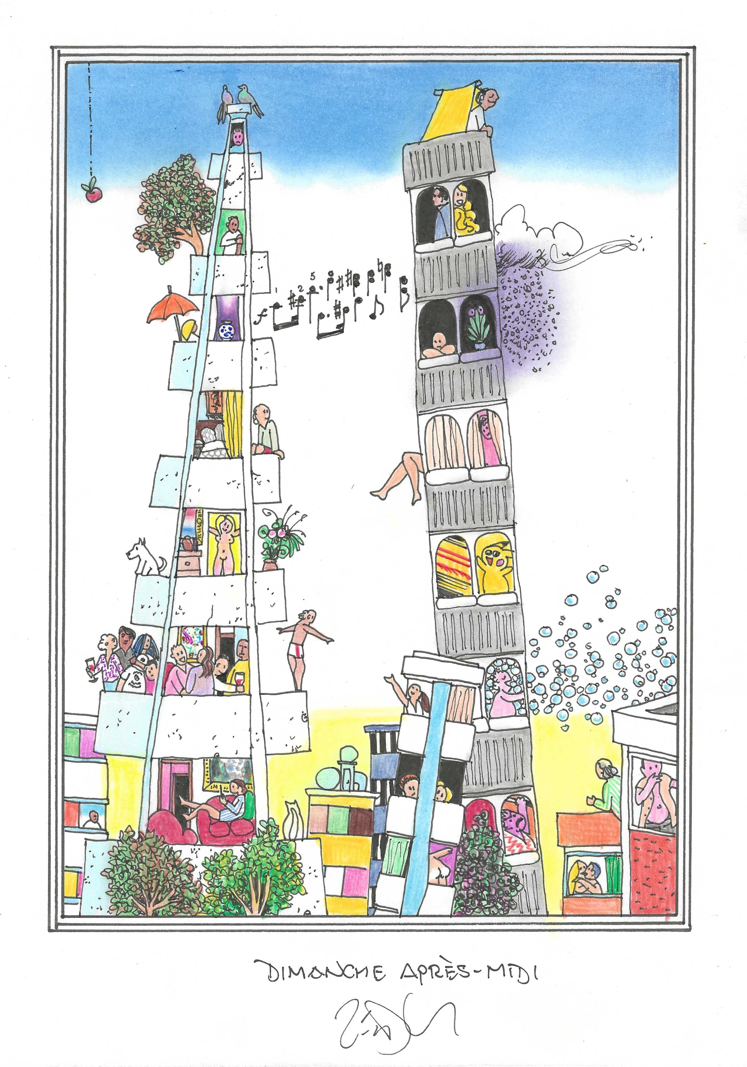 Drawing of the Day – 3367 – Dessin du jour « Sunday afternoon – Dimanche après-midi » Ink & colour on Paper – 8 x 12″ (21 x 30 cm) – Encre & couleurs sur Papier