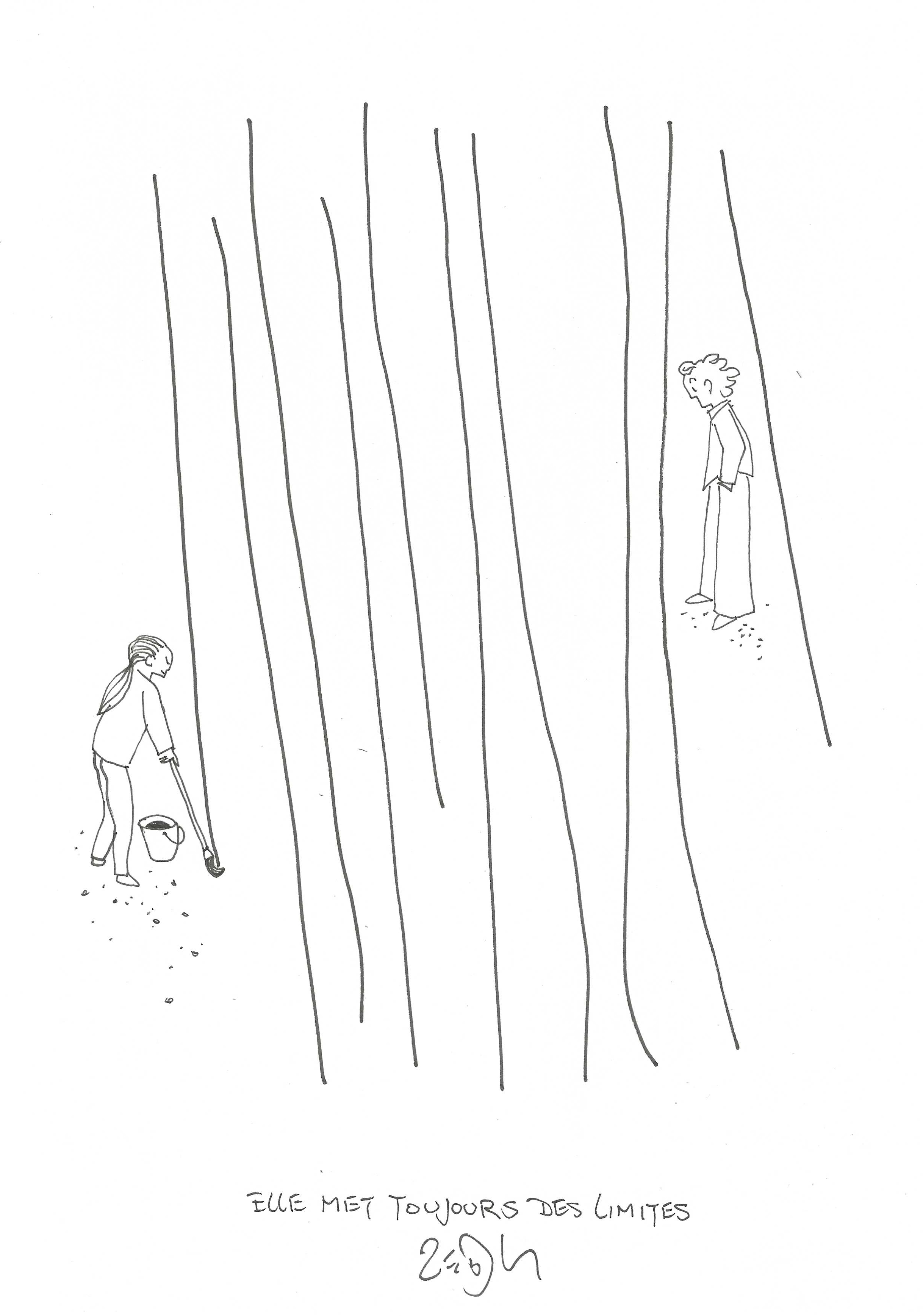 Drawing of the Day – 3368 – Dessin du jour « She is always drawing lines – Elle met toujours des limites » Ink on Paper – 8 x 12″ (21 x 30 cm) – Encre sur Papier