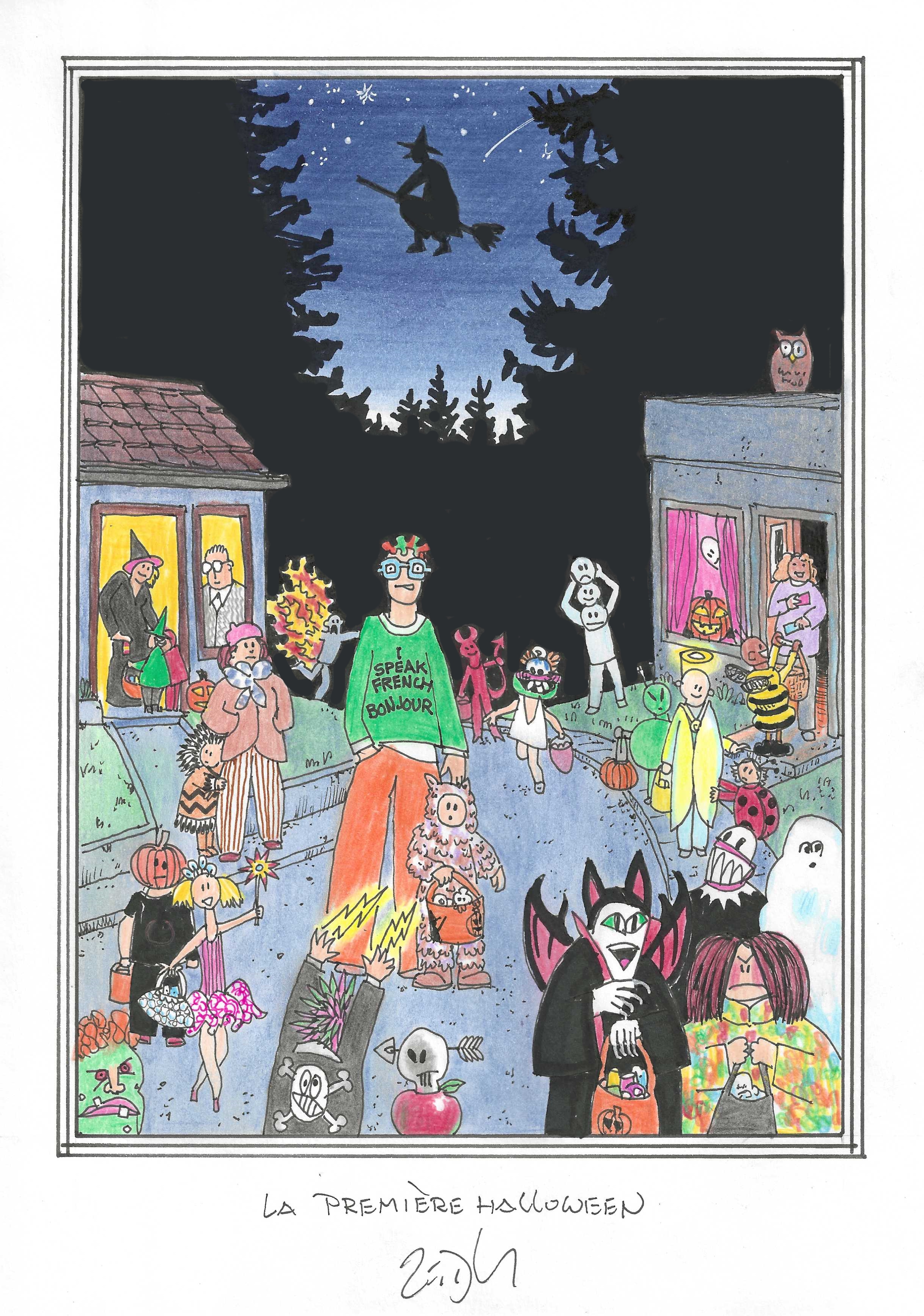 Drawing of the Day – 3371 – Dessin du jour « First Halloween – La première Halloween » Ink & colour on Paper – 8 x 12″ (21 x 30 cm) – Encre & couleurs sur Papier
