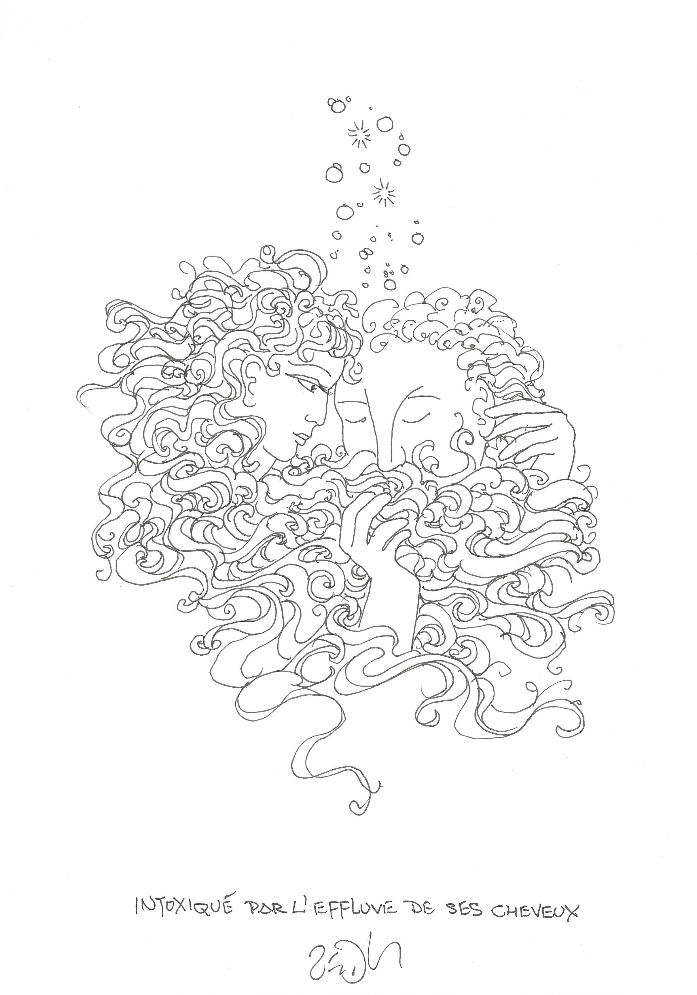 Drawing of the Day – 3346 – Dessin du jour « Intoxicated by the scent of her hair – Intoxiqué par l’effluve de ses cheveux » Ink on Paper – 8 x 12″ (21 x 30 cm) – Encre sur Papier